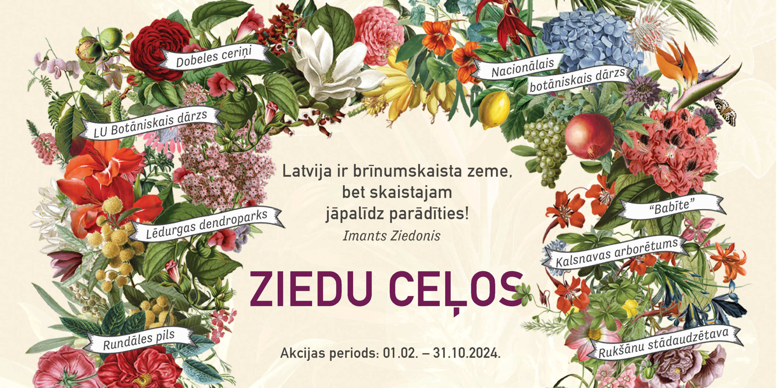 Apceļo astoņas ziedošās kolekcijas, krāj zīmodziņus un iepriecini sevi ar kādu pārsteiguma balvu, ko sarūpējuši dārzi! Akcija “Ziedu ceļos” šajā gadā ilgst no 1. februāra līdz 30. oktobrim. „Latvija ir brīnumskaista zeme, bet skaistajam jāpalīdz parādīties”, sacījis Imants Ziedonis, ar kura dzejas rindām jau 14. februārī aicināsim uz pirmo tematisko norisi LU Botāniskajā dārzā.