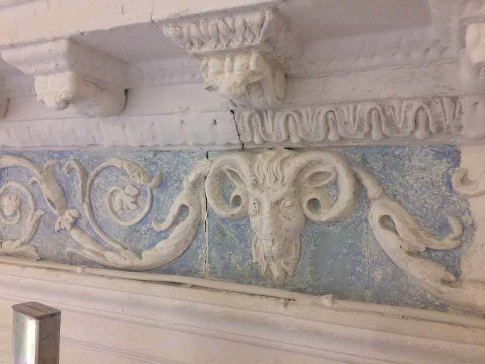 Pirms attīrīšanas telpas sienas viscaur klāja balsinājums un zem baltās kārtas iezīmējās reljefi veidojumi nekonkrētās formās. Tā kā telpa nav liela, aptuveni divdesmit cilvēkiem divu dienu laikā izdevās attīrīt apmēram vienu metru platu joslu visapkārt telpai pa perimetru. Pāris cilvēku strādāja uz stalažām, lai atsegtu nelielus laukumus pie griestiem, kas ļautu apjaust telpas sākotnējo izskatu. Noņemot balsinājuma un krāsu slāņus, atklājās brīnišķīgs dekors – klasicismam raksturīgās skaidrās līnijās veidotas baltas ziedu vijas un rozetes, auna galviņas un citi ornamenti uz zilgani krāsota fona.