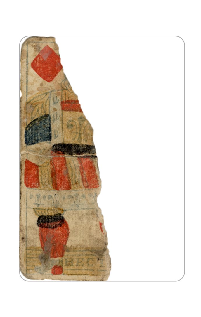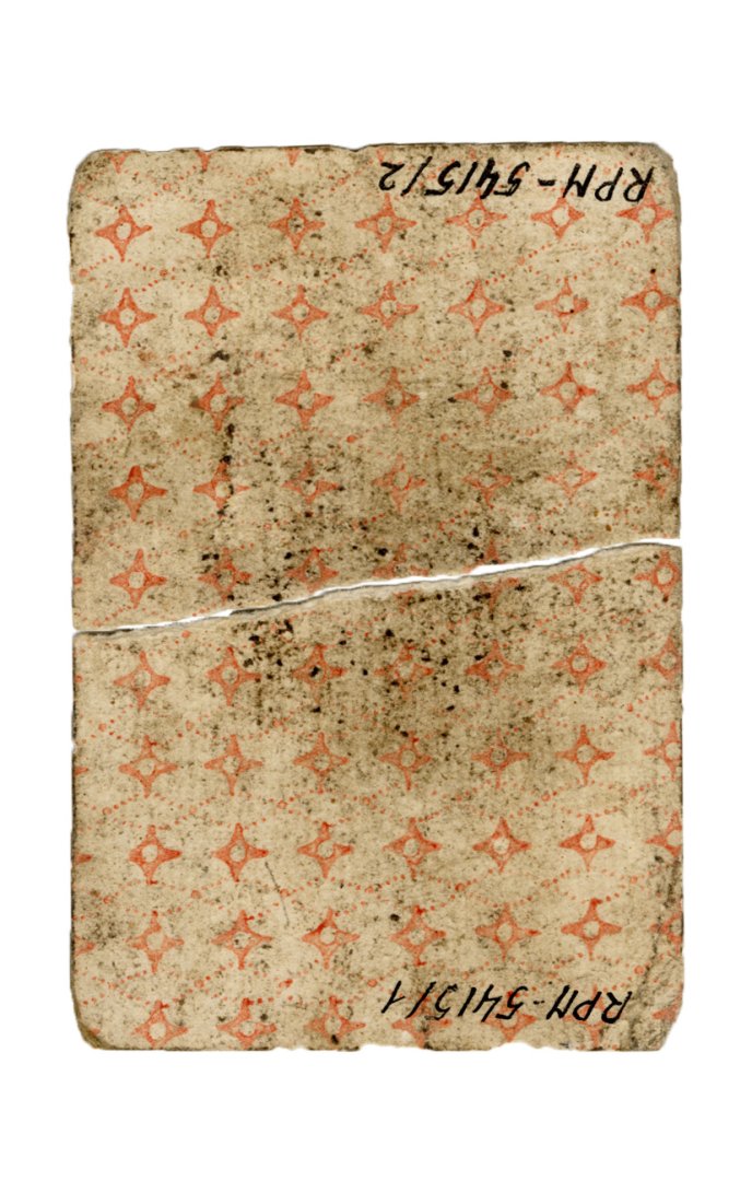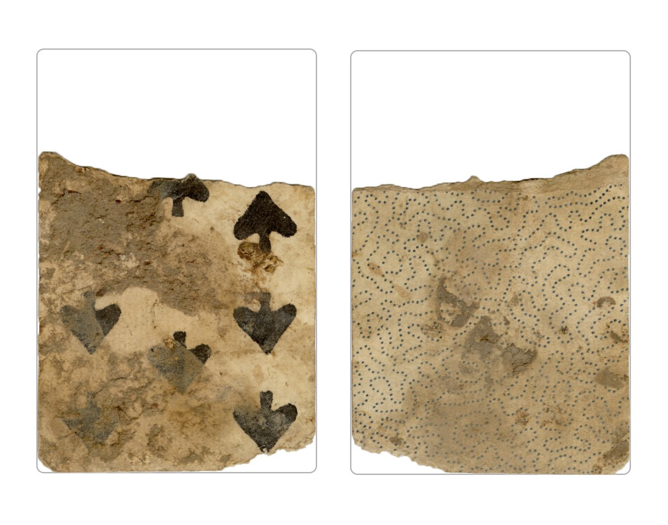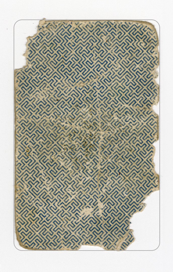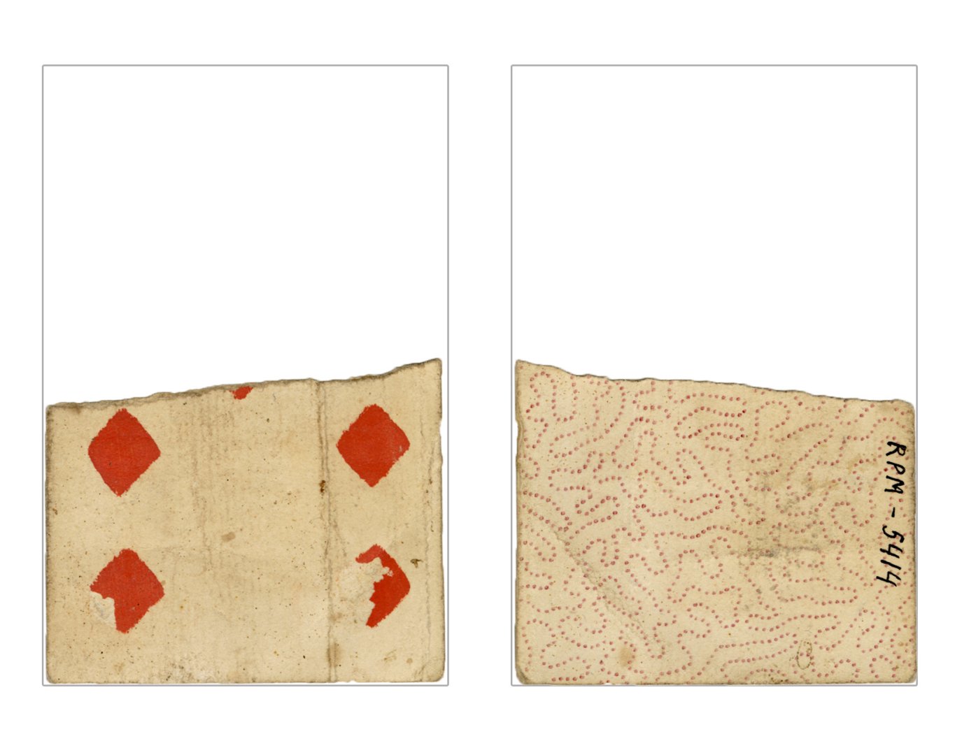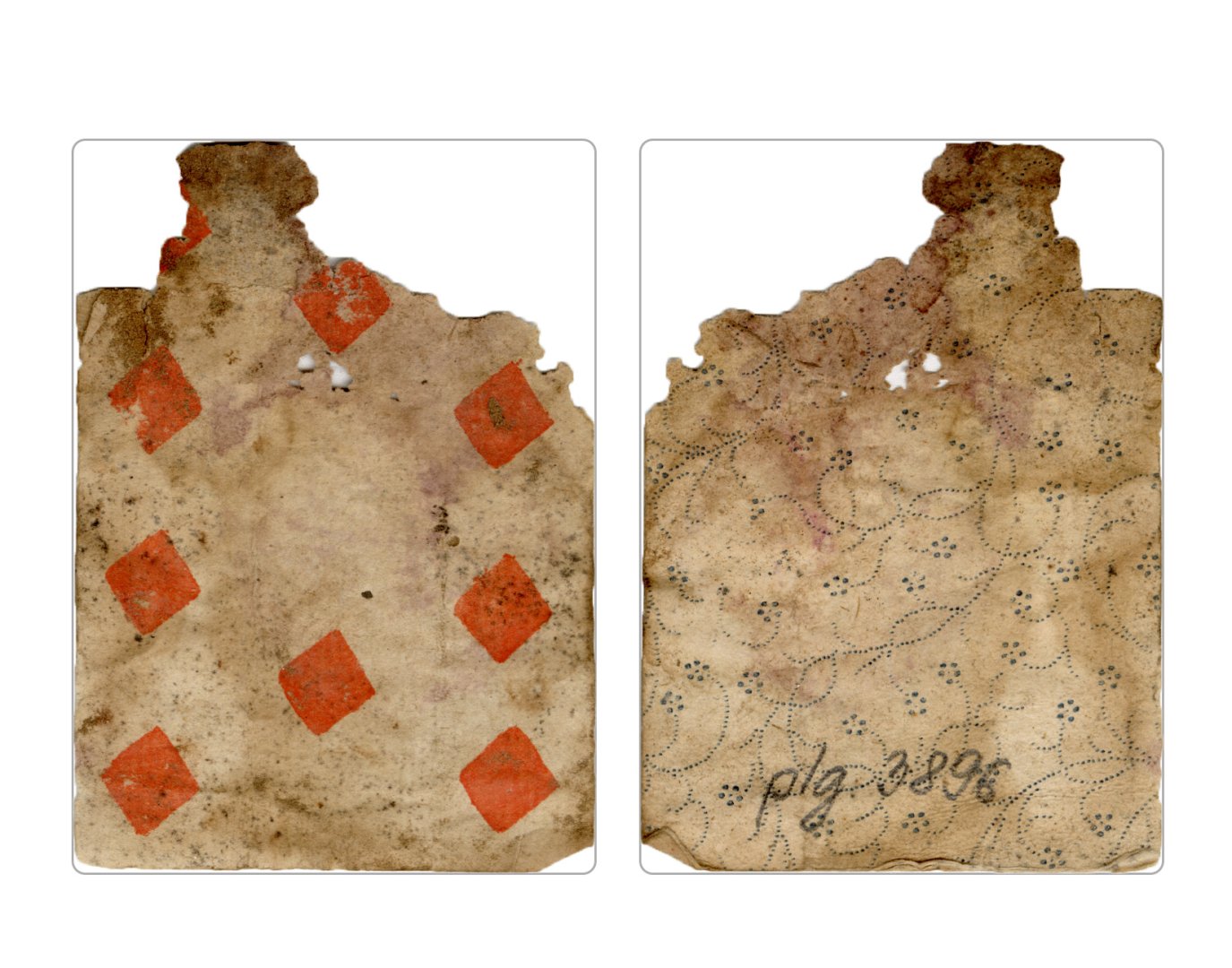 The cards and their fragments all belong to the same deck. The back of the deck features a simple geometrical pattern in red, where rows of red, rhombus-shaped symbols intertwine with fine dotted lines. This pattern, however, appears in multiple countries, and therefore can serve little in the way of authenticating these cards. The British Museum’s collection includes Dutch lottery cards with a very similar pattern. However, these are dated much later – 1820.[22] Furthermore, Colombia University’s digital library contains three types of French-suited card decks with the same pattern, except in blue or black, dated as 1750 [23], 1780 [24] and 1790. [25]