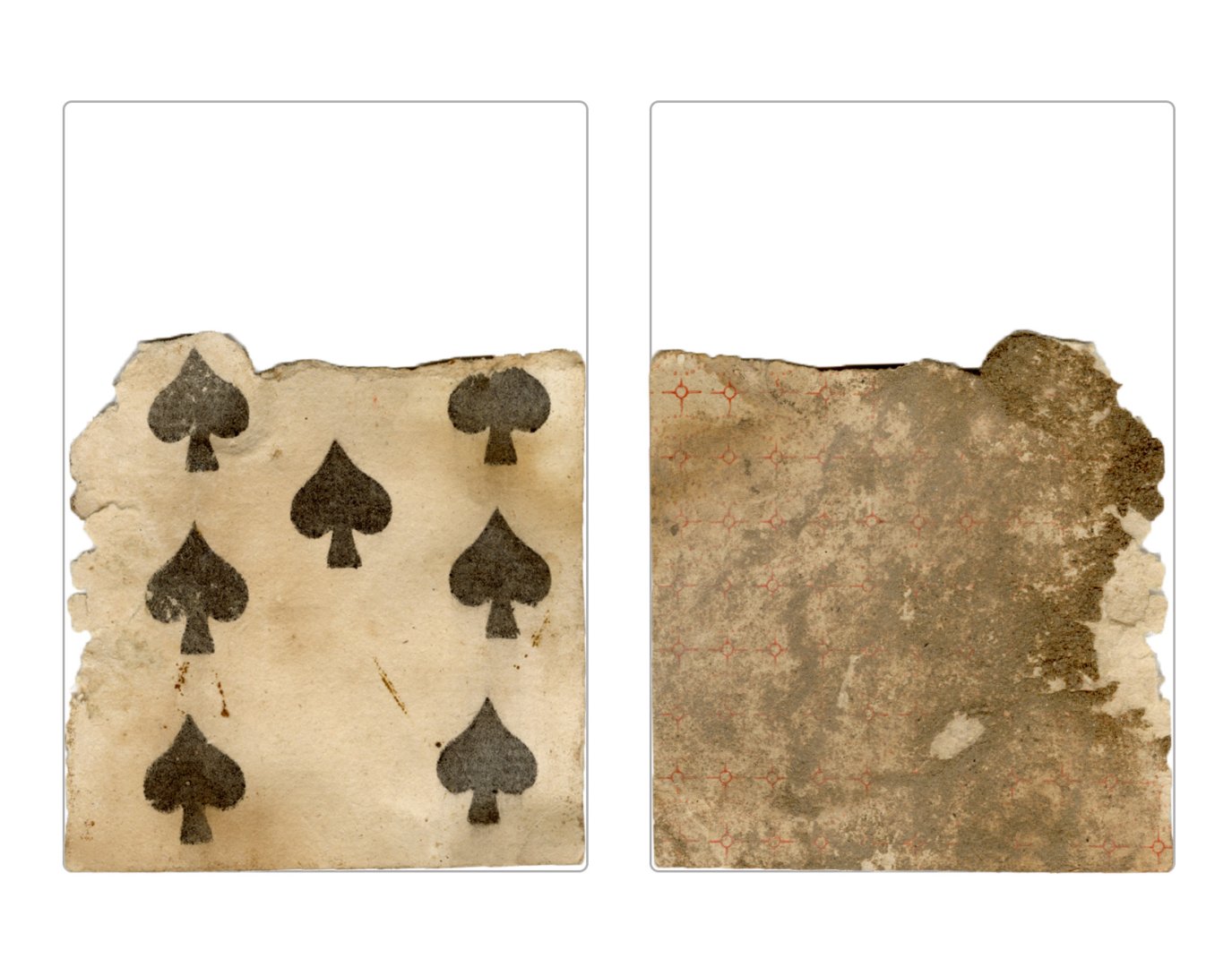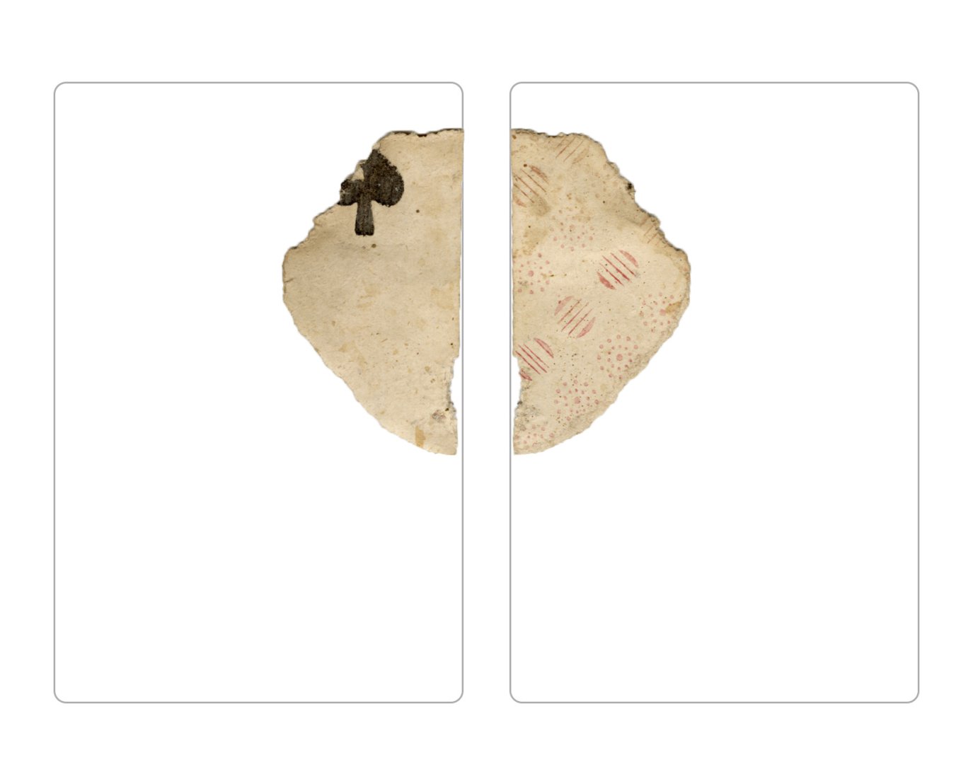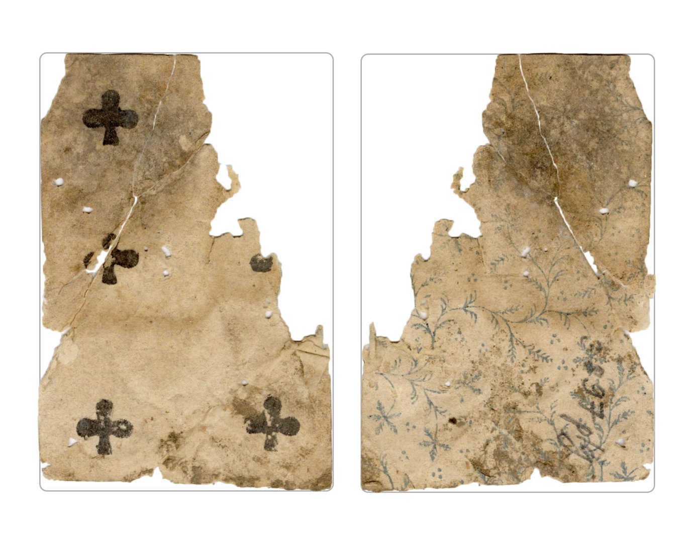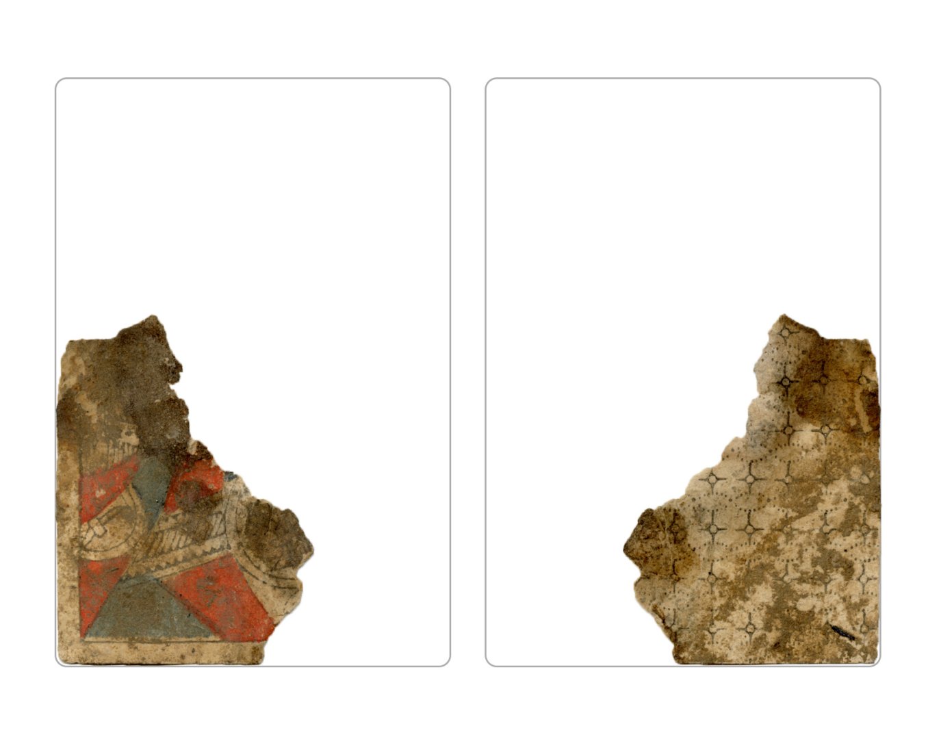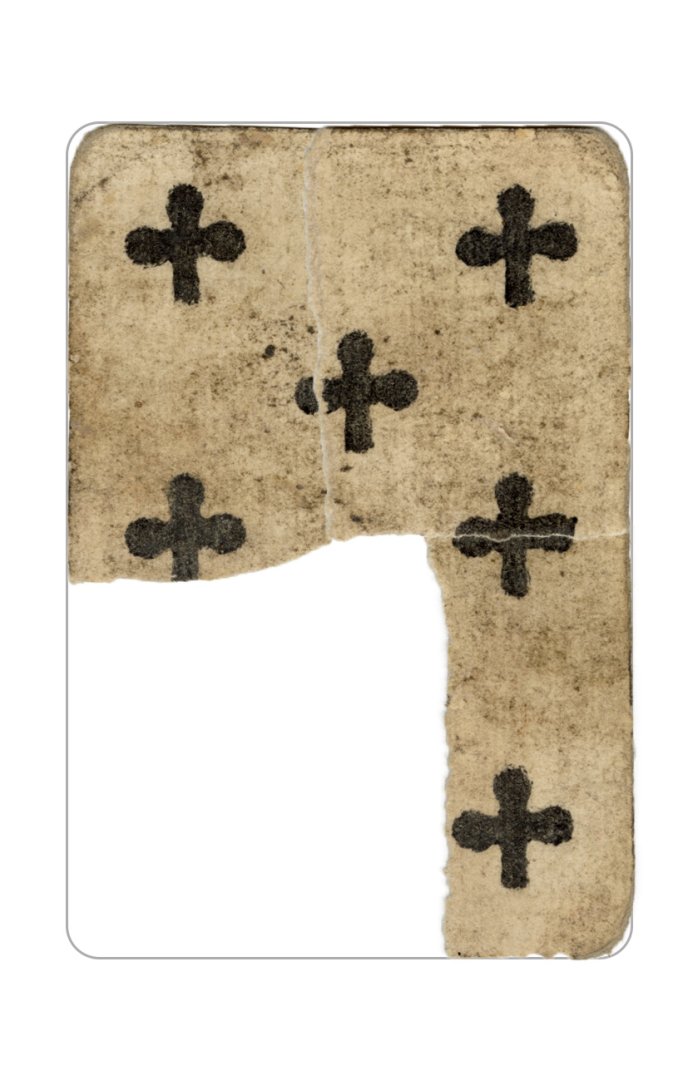 The cards and their fragments all belong to the same deck. The back of the deck features a simple geometrical pattern in red, where rows of red, rhombus-shaped symbols intertwine with fine dotted lines. This pattern, however, appears in multiple countries, and therefore can serve little in the way of authenticating these cards. The British Museum’s collection includes Dutch lottery cards with a very similar pattern. However, these are dated much later – 1820.[22] Furthermore, Colombia University’s digital library contains three types of French-suited card decks with the same pattern, except in blue or black, dated as 1750 [23], 1780 [24] and 1790. [25]