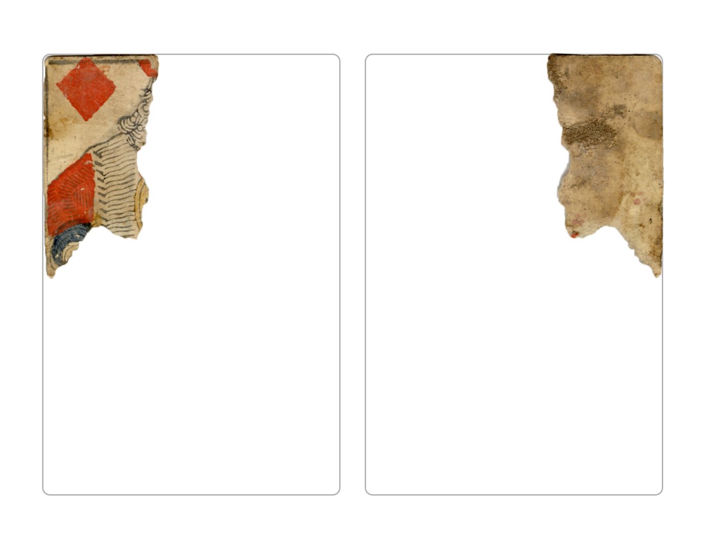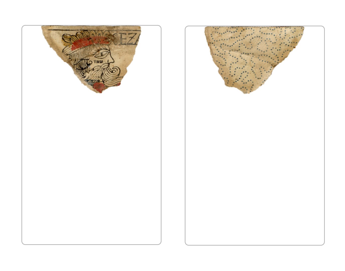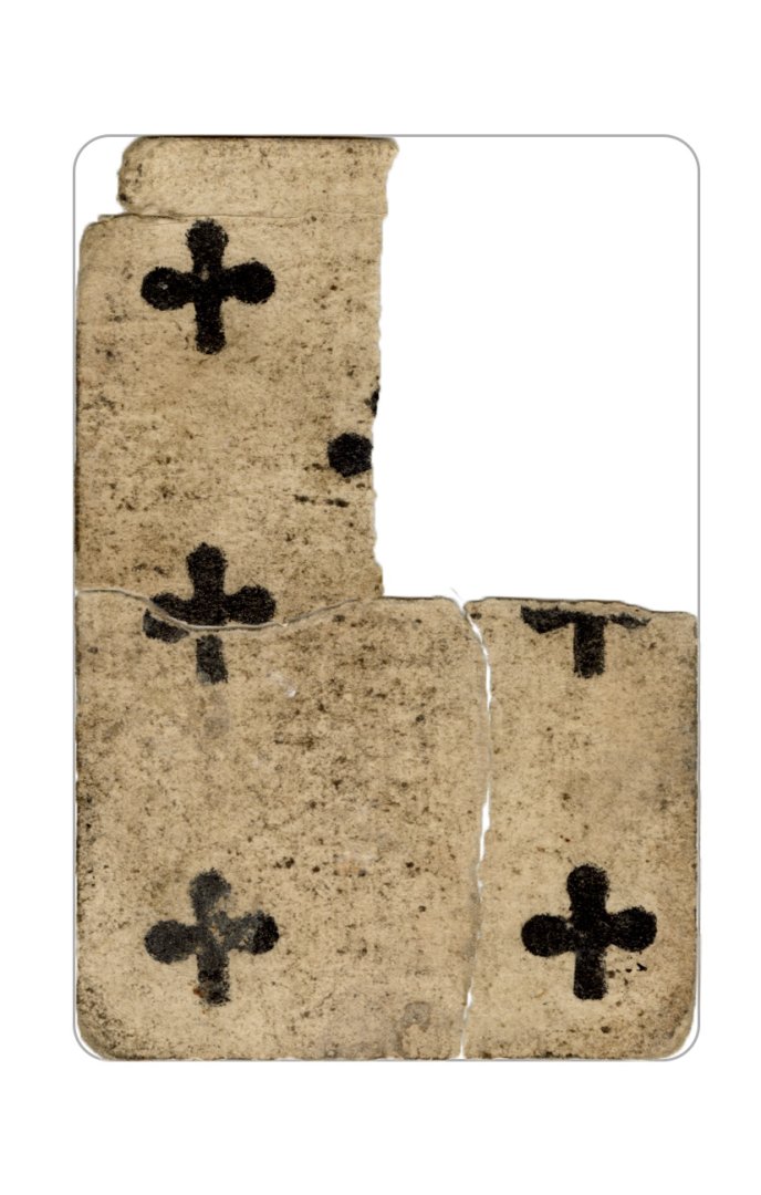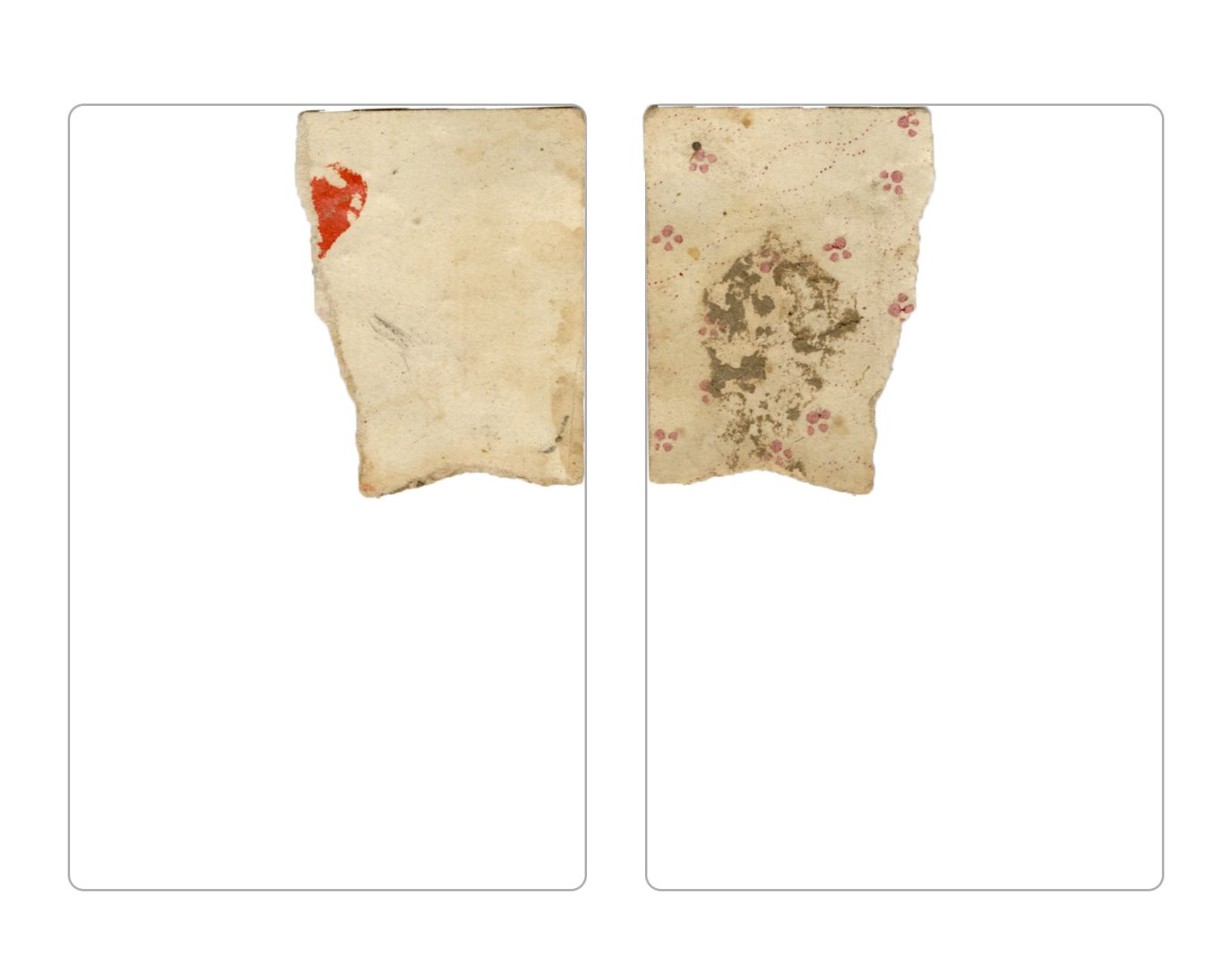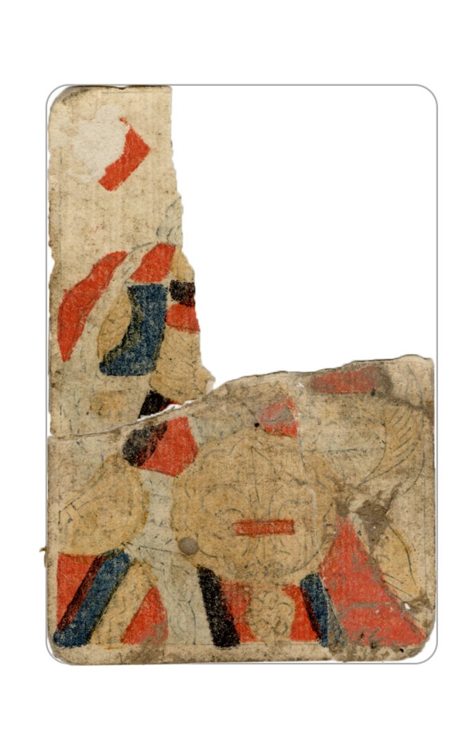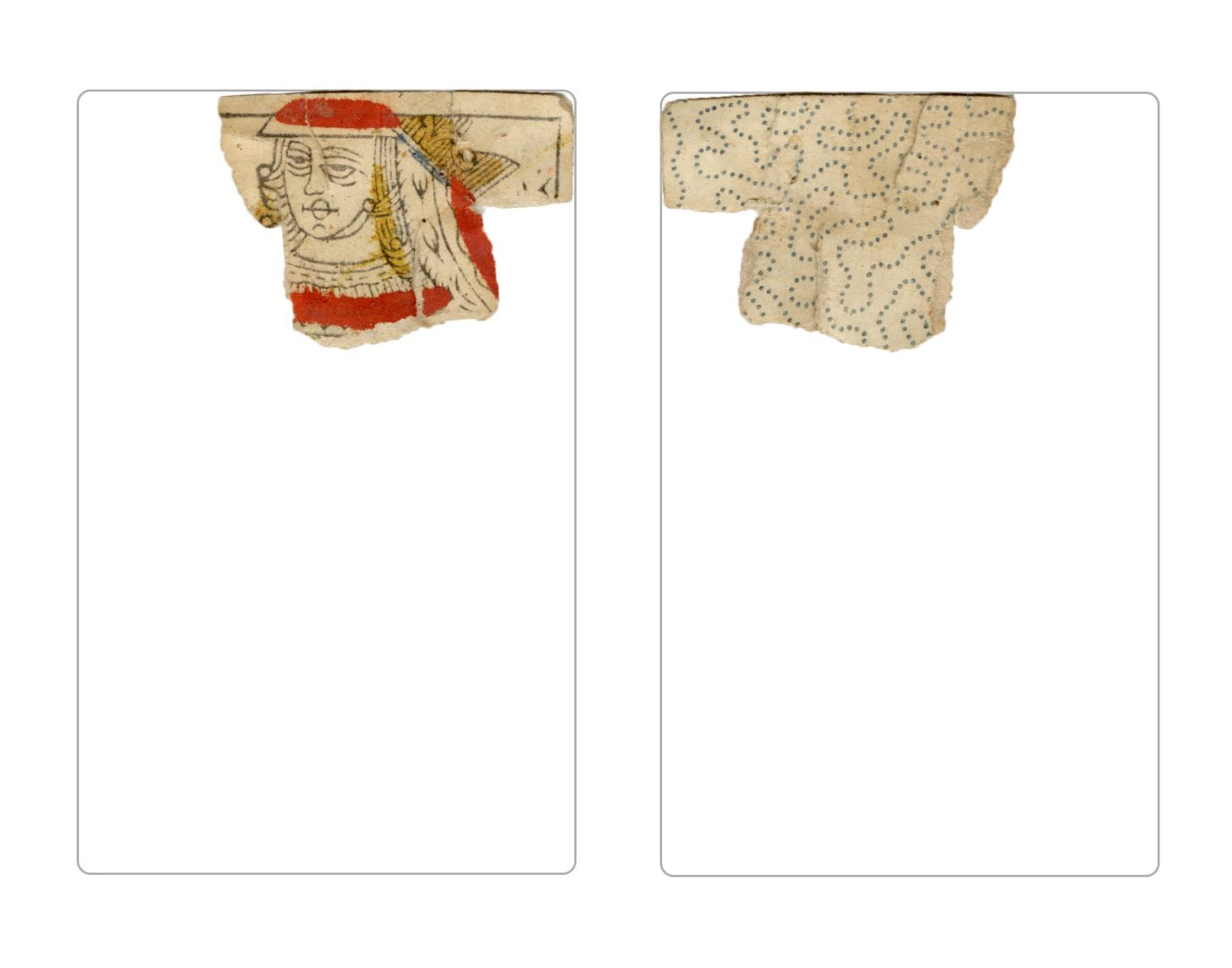 The cards and their fragments all belong to the same deck. The back of the deck features a simple geometrical pattern in red, where rows of red, rhombus-shaped symbols intertwine with fine dotted lines. This pattern, however, appears in multiple countries, and therefore can serve little in the way of authenticating these cards. The British Museum’s collection includes Dutch lottery cards with a very similar pattern. However, these are dated much later – 1820.[22] Furthermore, Colombia University’s digital library contains three types of French-suited card decks with the same pattern, except in blue or black, dated as 1750 [23], 1780 [24] and 1790. [25]