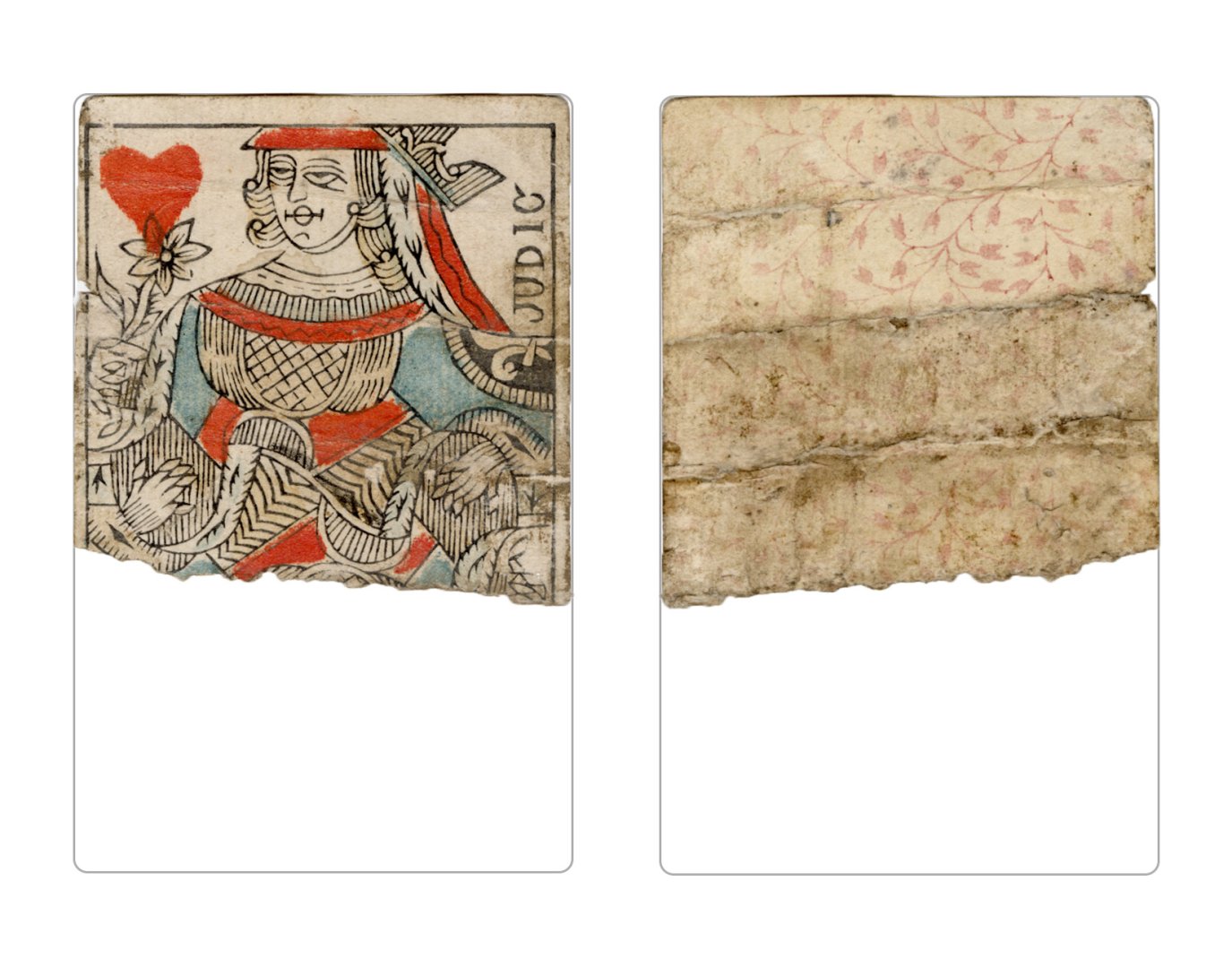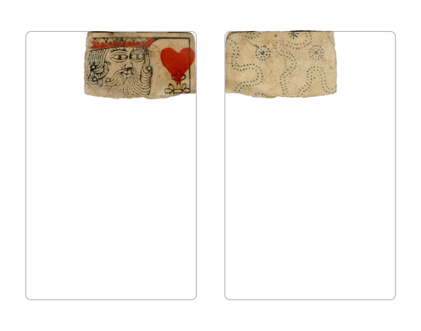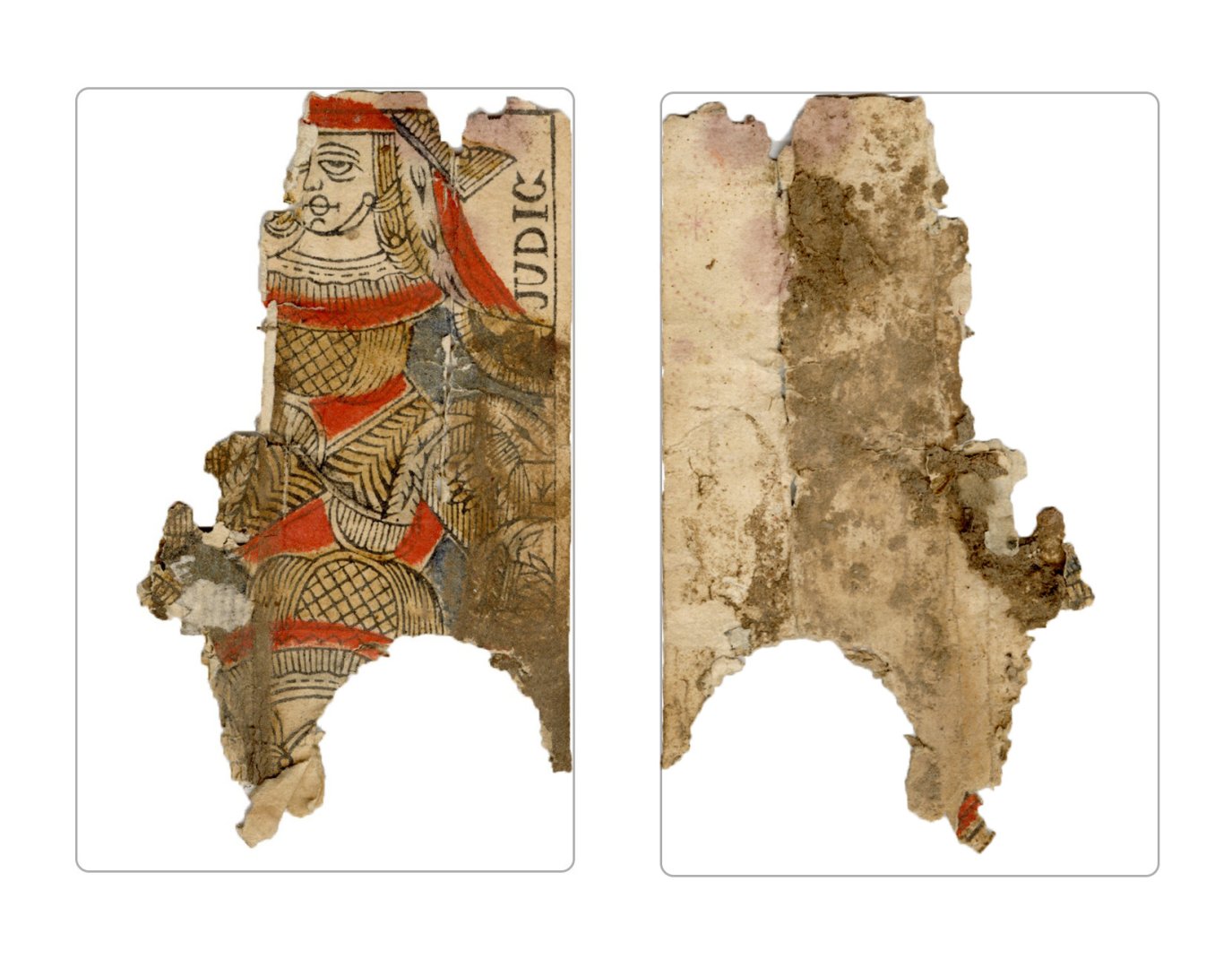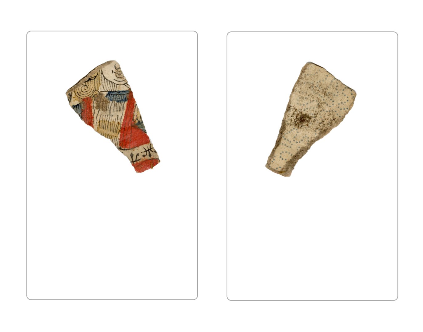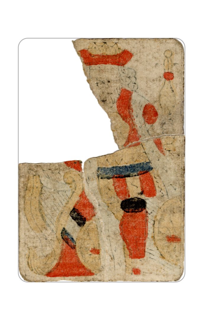 The cards and their fragments all belong to the same deck. The back of the deck features a simple geometrical pattern in red, where rows of red, rhombus-shaped symbols intertwine with fine dotted lines. This pattern, however, appears in multiple countries, and therefore can serve little in the way of authenticating these cards. The British Museum’s collection includes Dutch lottery cards with a very similar pattern. However, these are dated much later – 1820.[22] Furthermore, Colombia University’s digital library contains three types of French-suited card decks with the same pattern, except in blue or black, dated as 1750 [23], 1780 [24] and 1790. [25]