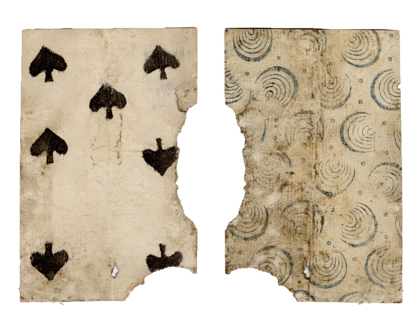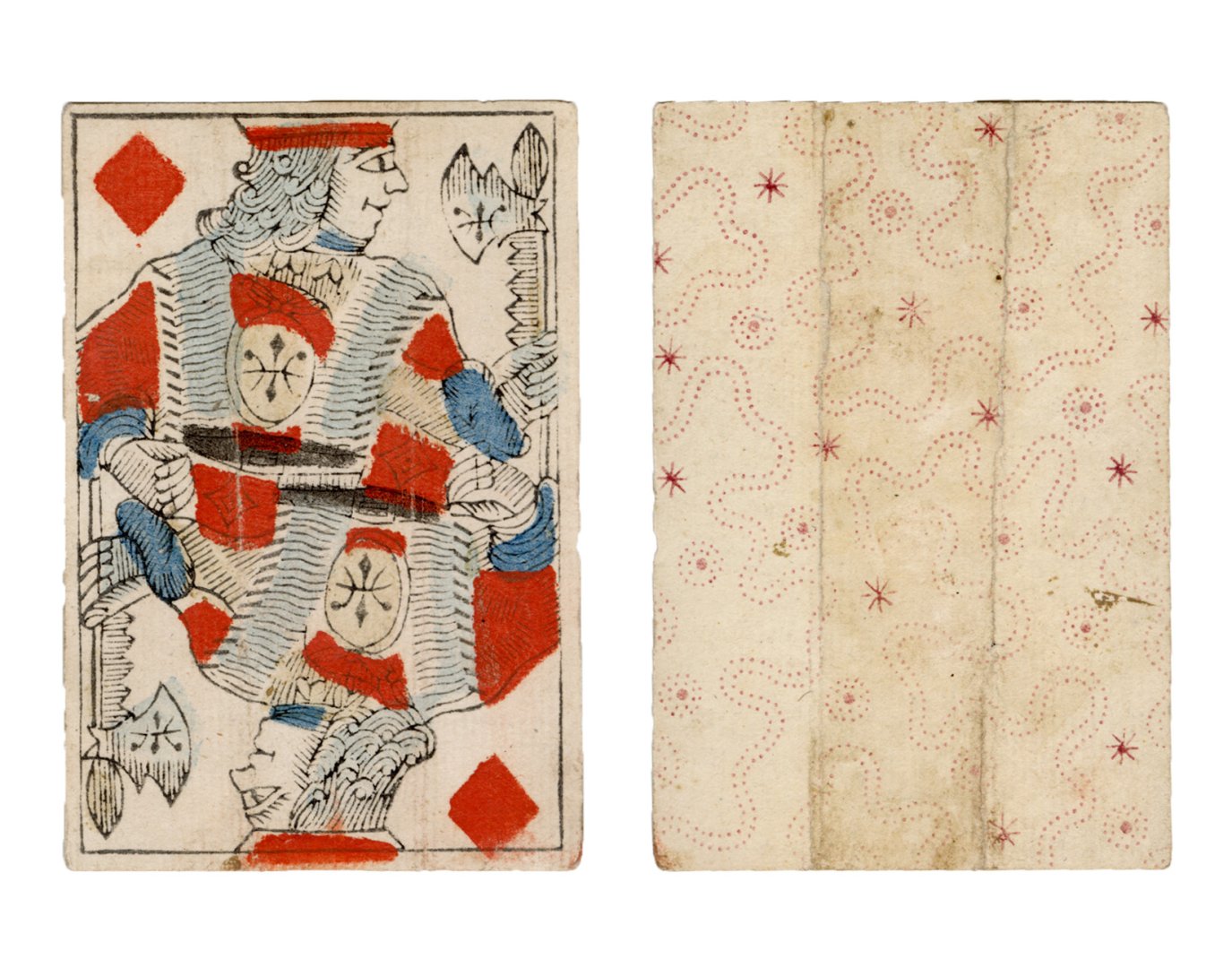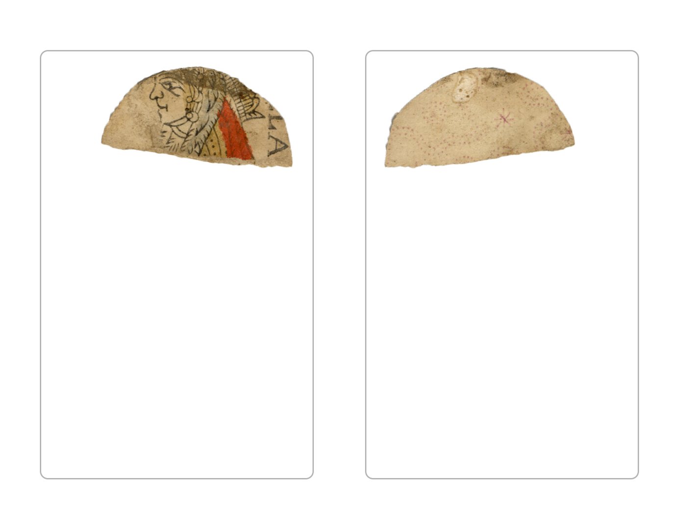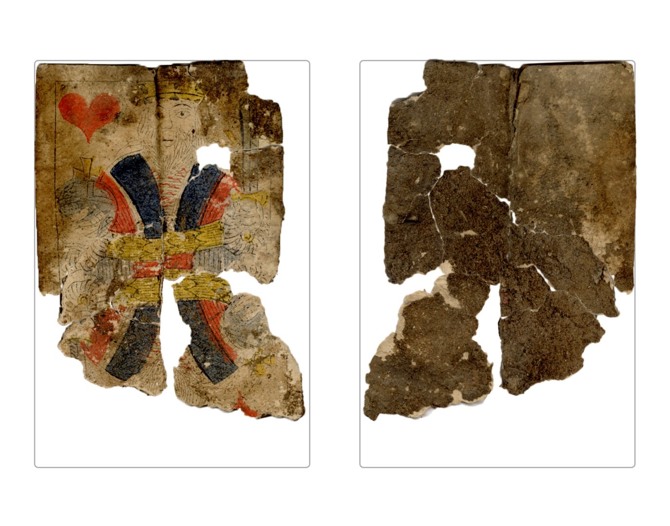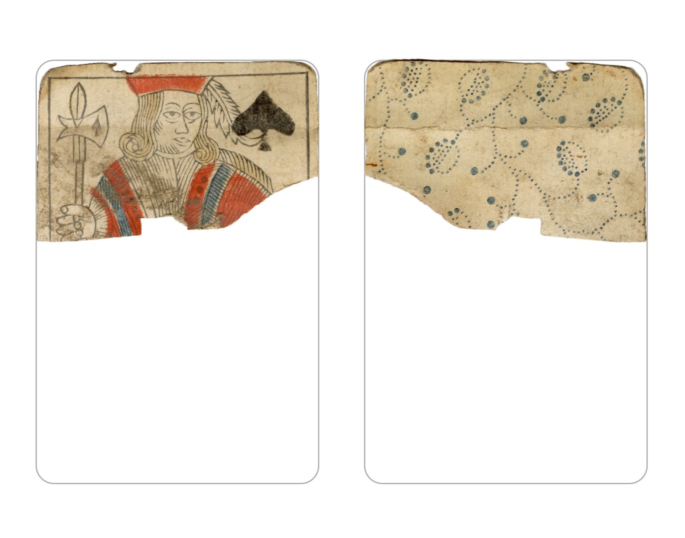 The cards and their fragments all belong to the same deck. The back of the deck features a simple geometrical pattern in red, where rows of red, rhombus-shaped symbols intertwine with fine dotted lines. This pattern, however, appears in multiple countries, and therefore can serve little in the way of authenticating these cards. The British Museum’s collection includes Dutch lottery cards with a very similar pattern. However, these are dated much later – 1820.[22] Furthermore, Colombia University’s digital library contains three types of French-suited card decks with the same pattern, except in blue or black, dated as 1750 [23], 1780 [24] and 1790. [25]