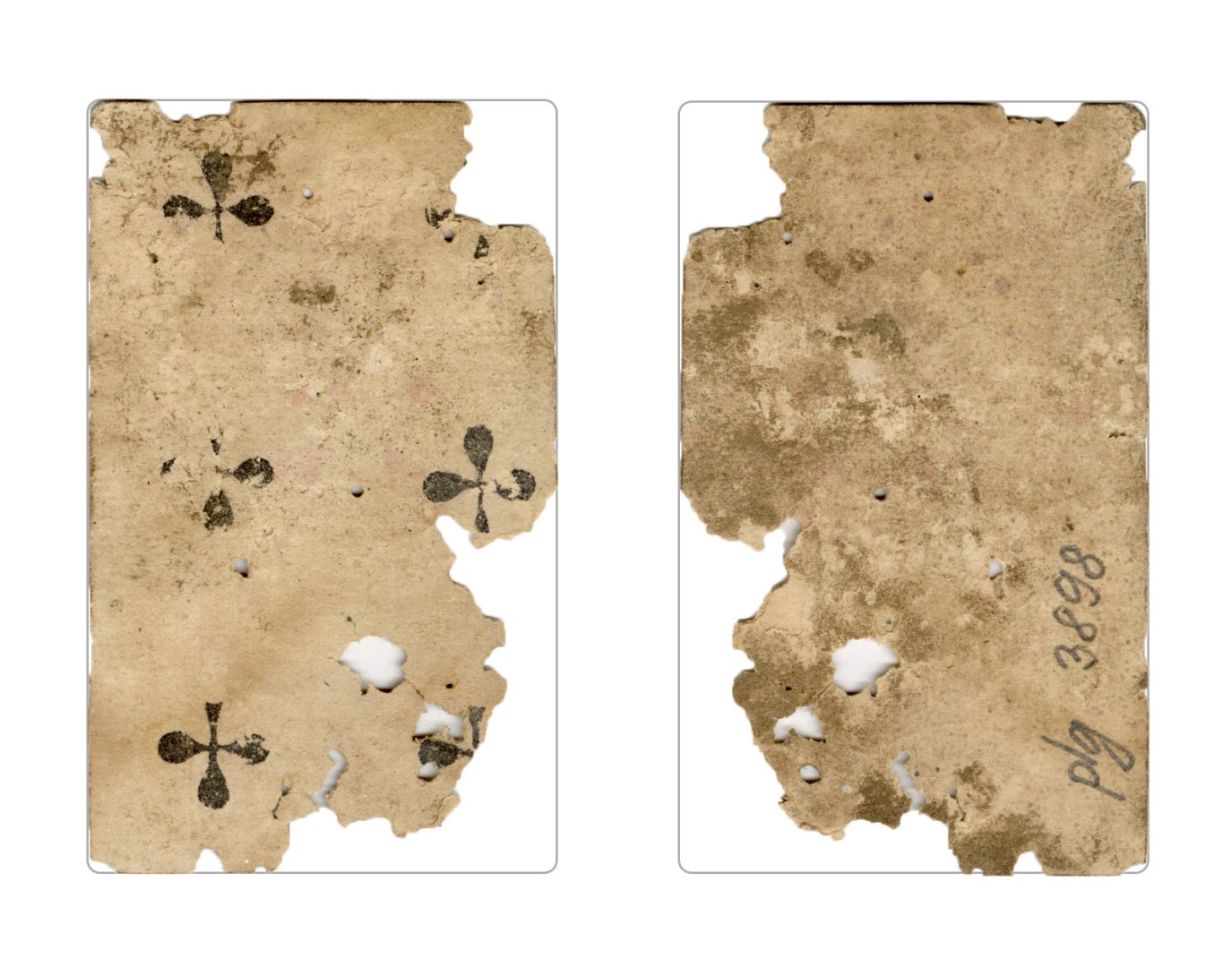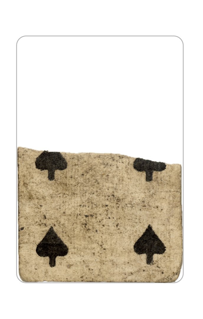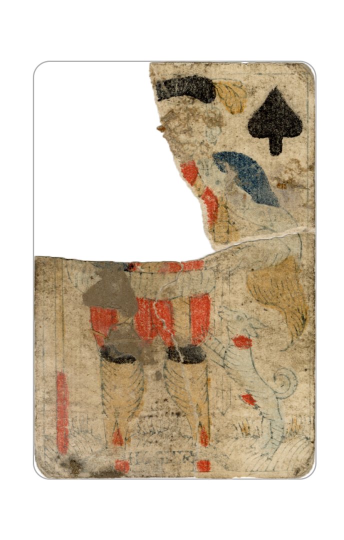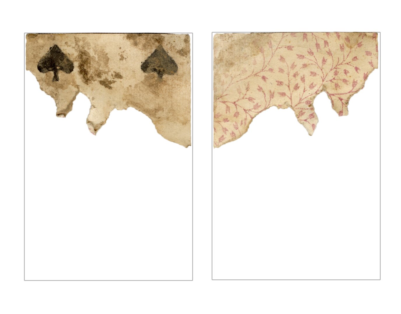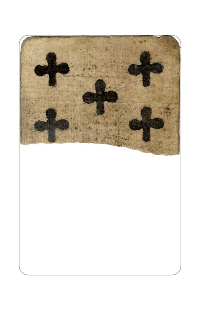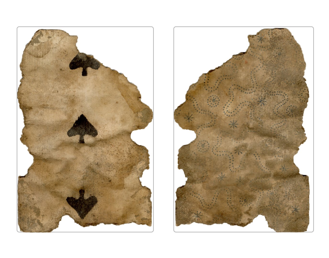 The cards and their fragments all belong to the same deck. The back of the deck features a simple geometrical pattern in red, where rows of red, rhombus-shaped symbols intertwine with fine dotted lines. This pattern, however, appears in multiple countries, and therefore can serve little in the way of authenticating these cards. The British Museum’s collection includes Dutch lottery cards with a very similar pattern. However, these are dated much later – 1820.[22] Furthermore, Colombia University’s digital library contains three types of French-suited card decks with the same pattern, except in blue or black, dated as 1750 [23], 1780 [24] and 1790. [25]