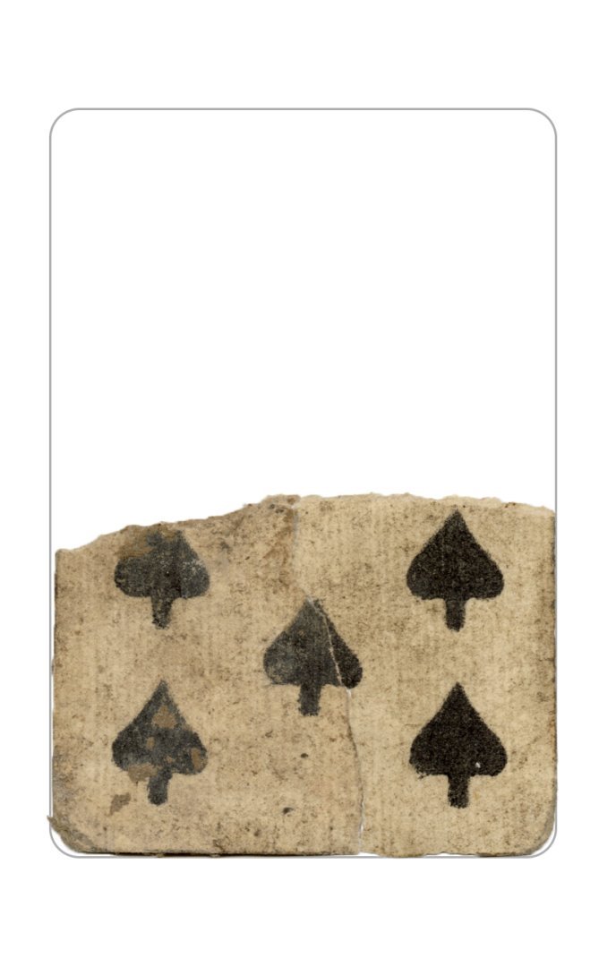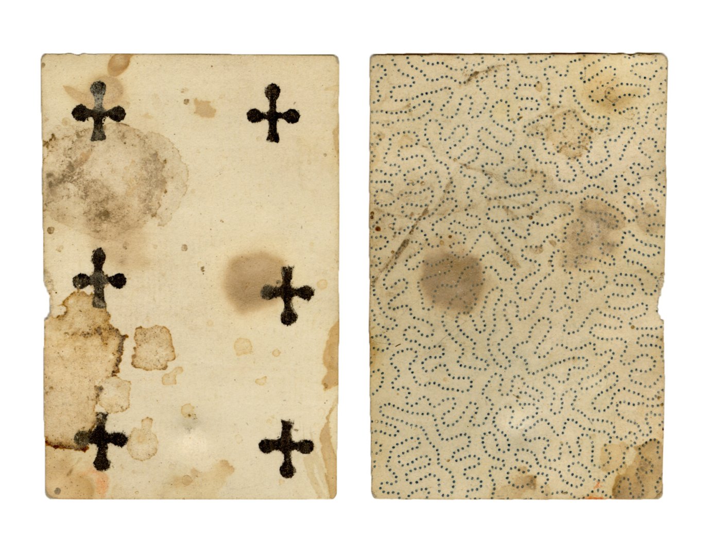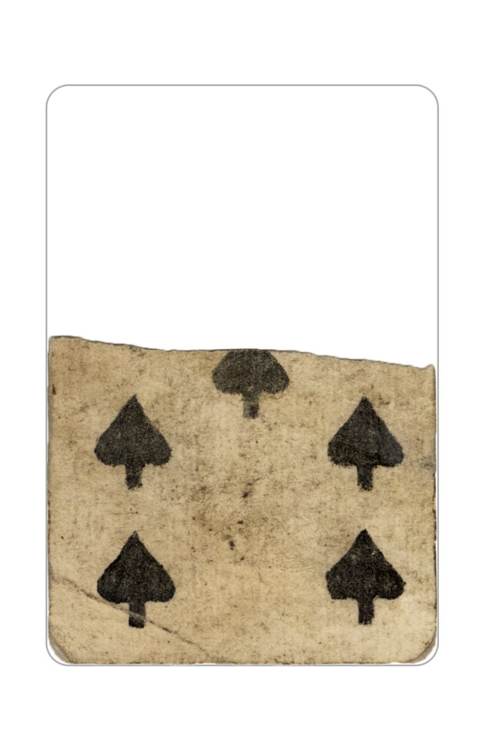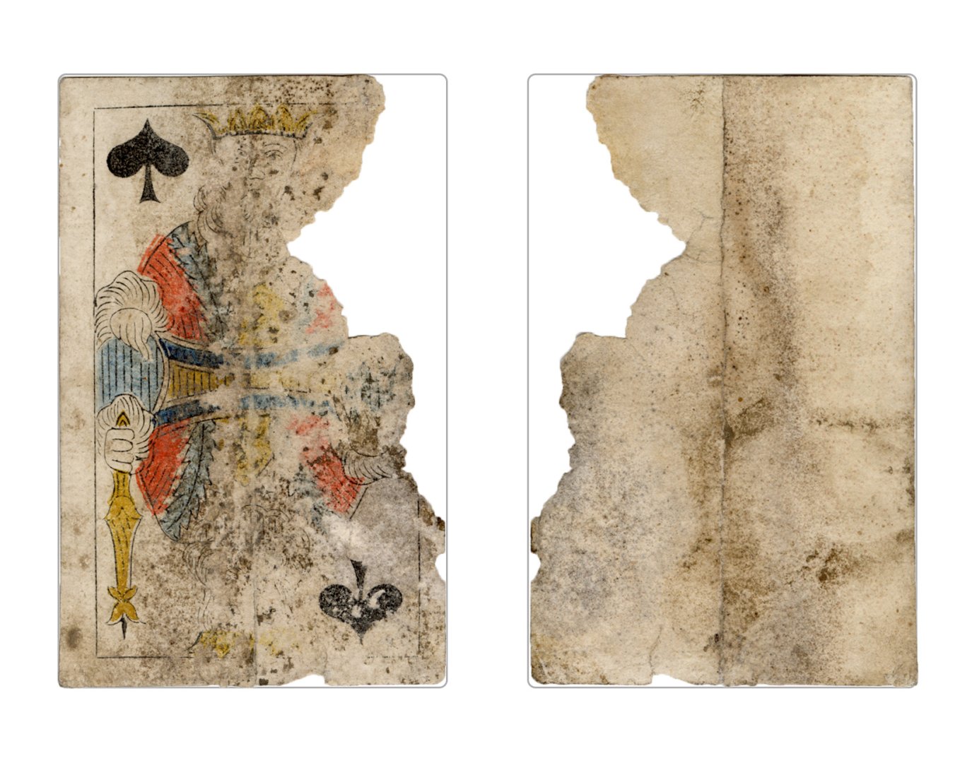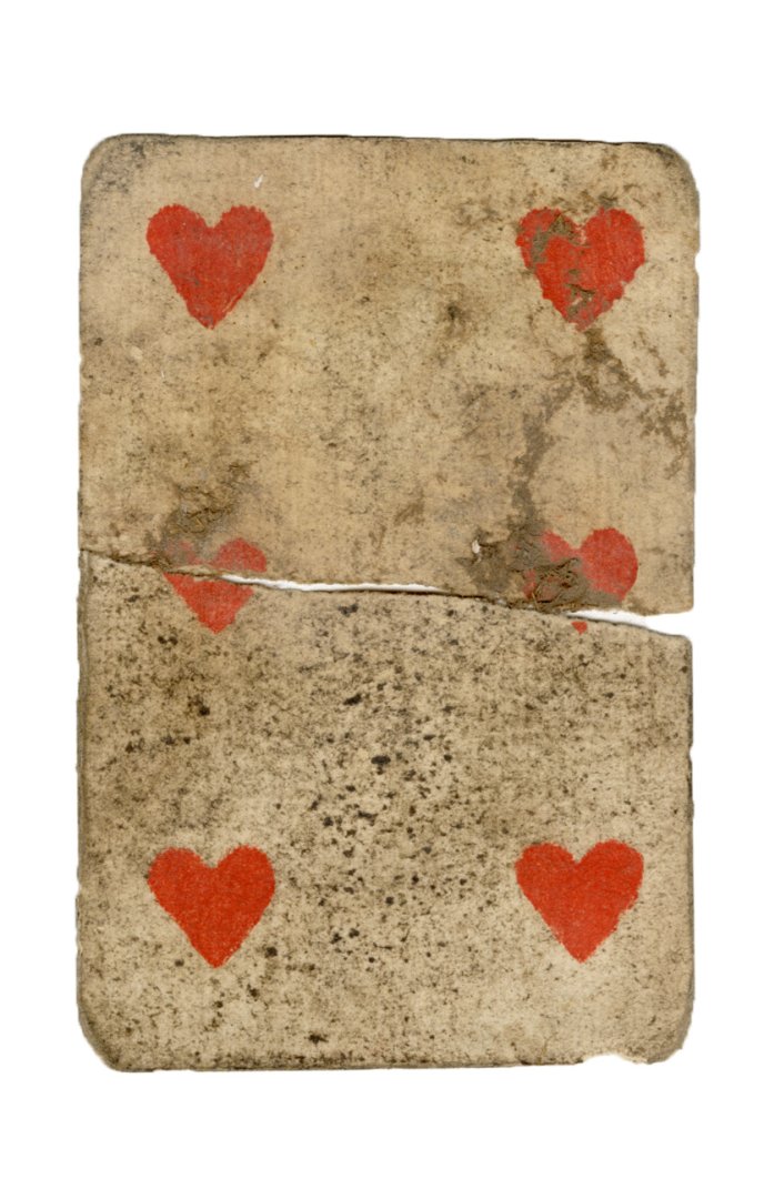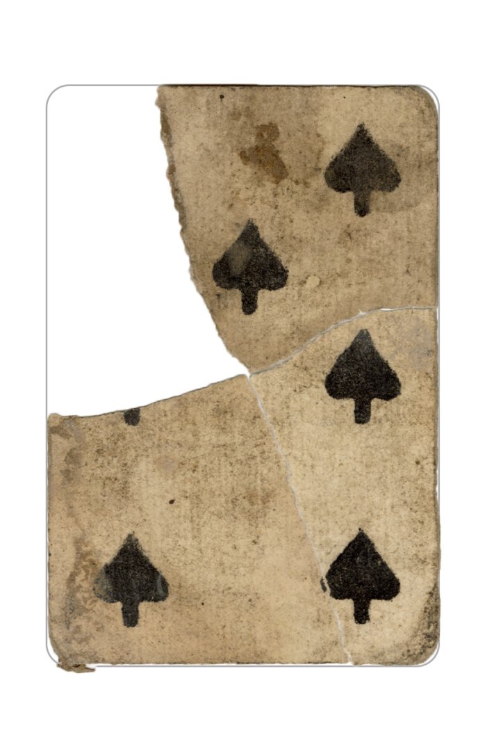 The cards and their fragments all belong to the same deck. The back of the deck features a simple geometrical pattern in red, where rows of red, rhombus-shaped symbols intertwine with fine dotted lines. This pattern, however, appears in multiple countries, and therefore can serve little in the way of authenticating these cards. The British Museum’s collection includes Dutch lottery cards with a very similar pattern. However, these are dated much later – 1820.[22] Furthermore, Colombia University’s digital library contains three types of French-suited card decks with the same pattern, except in blue or black, dated as 1750 [23], 1780 [24] and 1790. [25]