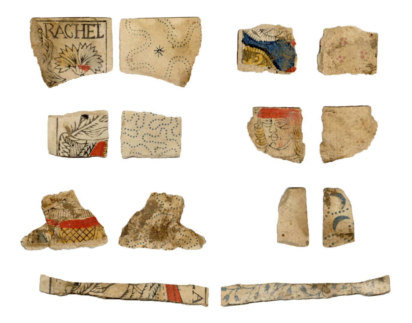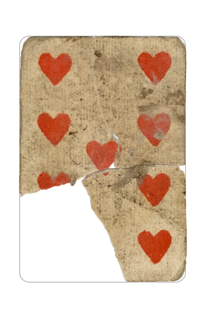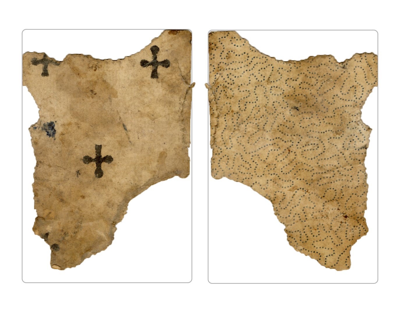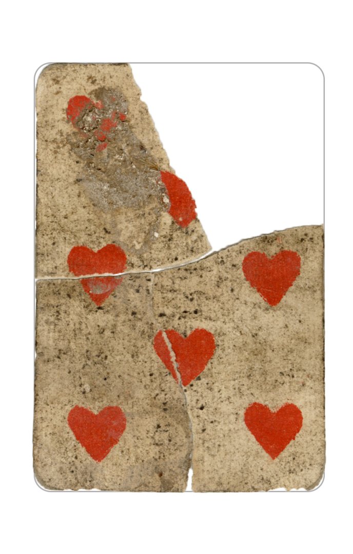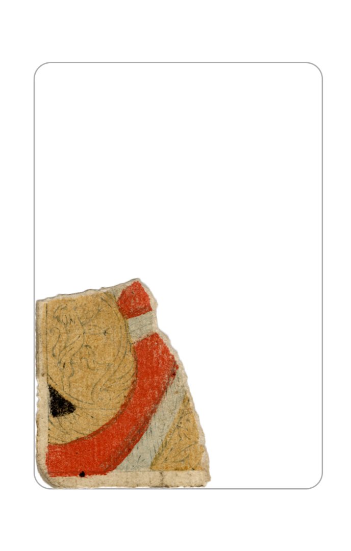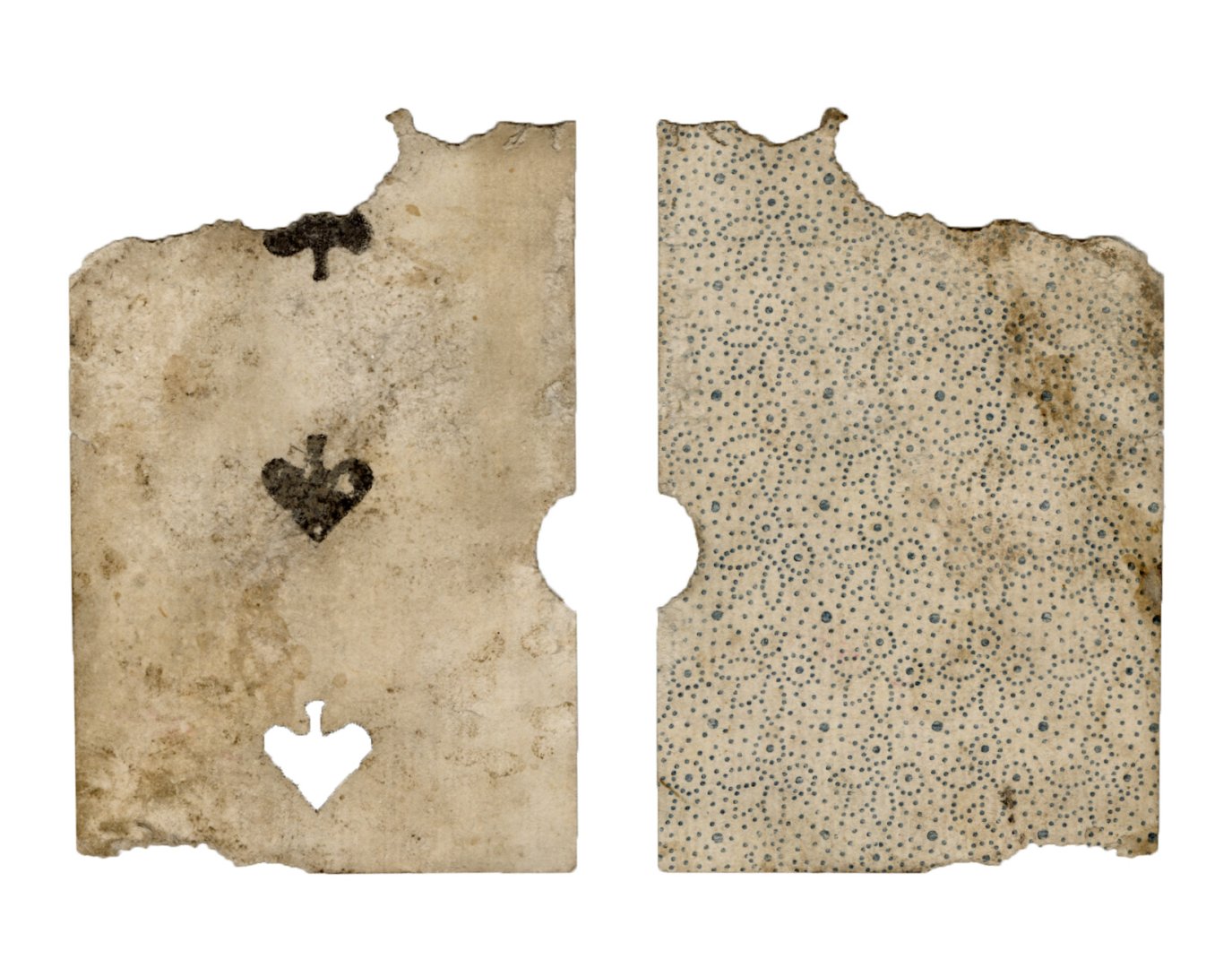 The cards and their fragments all belong to the same deck. The back of the deck features a simple geometrical pattern in red, where rows of red, rhombus-shaped symbols intertwine with fine dotted lines. This pattern, however, appears in multiple countries, and therefore can serve little in the way of authenticating these cards. The British Museum’s collection includes Dutch lottery cards with a very similar pattern. However, these are dated much later – 1820.[22] Furthermore, Colombia University’s digital library contains three types of French-suited card decks with the same pattern, except in blue or black, dated as 1750 [23], 1780 [24] and 1790. [25]