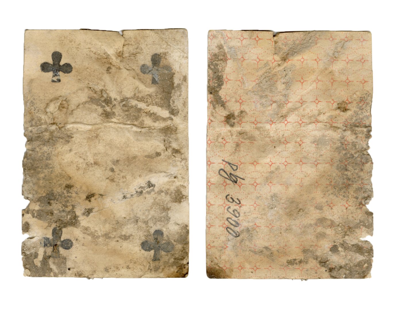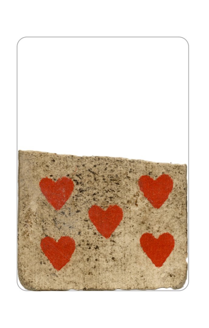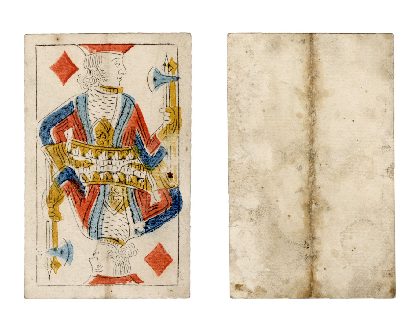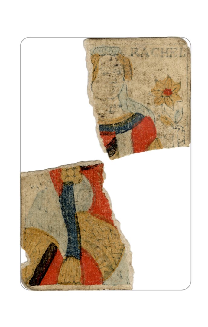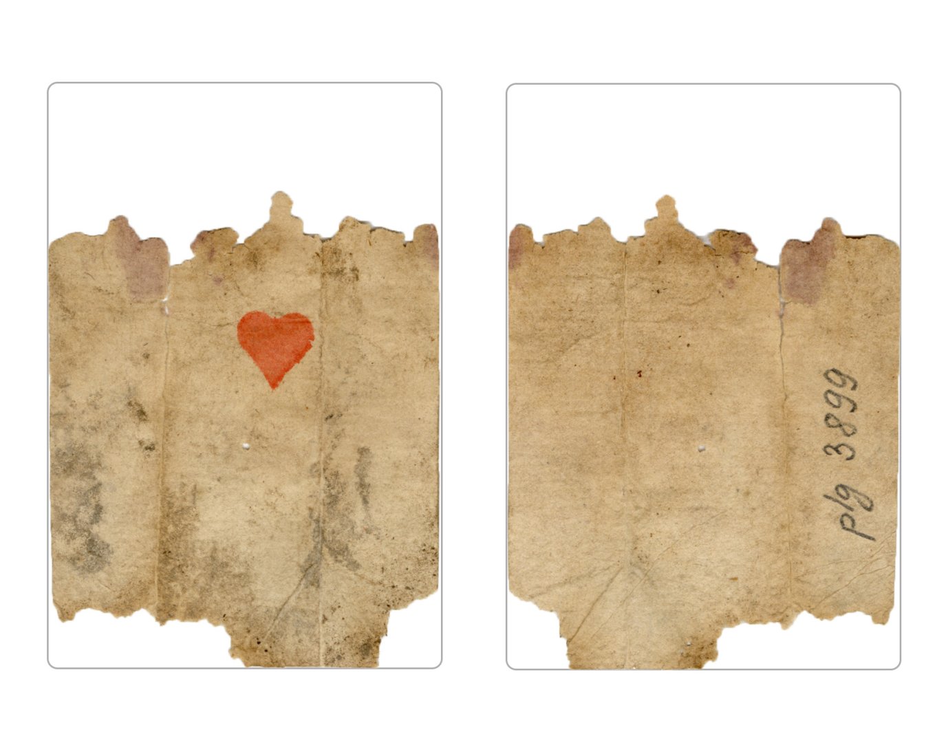 The cards and their fragments all belong to the same deck. The back of the deck features a simple geometrical pattern in red, where rows of red, rhombus-shaped symbols intertwine with fine dotted lines. This pattern, however, appears in multiple countries, and therefore can serve little in the way of authenticating these cards. The British Museum’s collection includes Dutch lottery cards with a very similar pattern. However, these are dated much later – 1820.[22] Furthermore, Colombia University’s digital library contains three types of French-suited card decks with the same pattern, except in blue or black, dated as 1750 [23], 1780 [24] and 1790. [25]