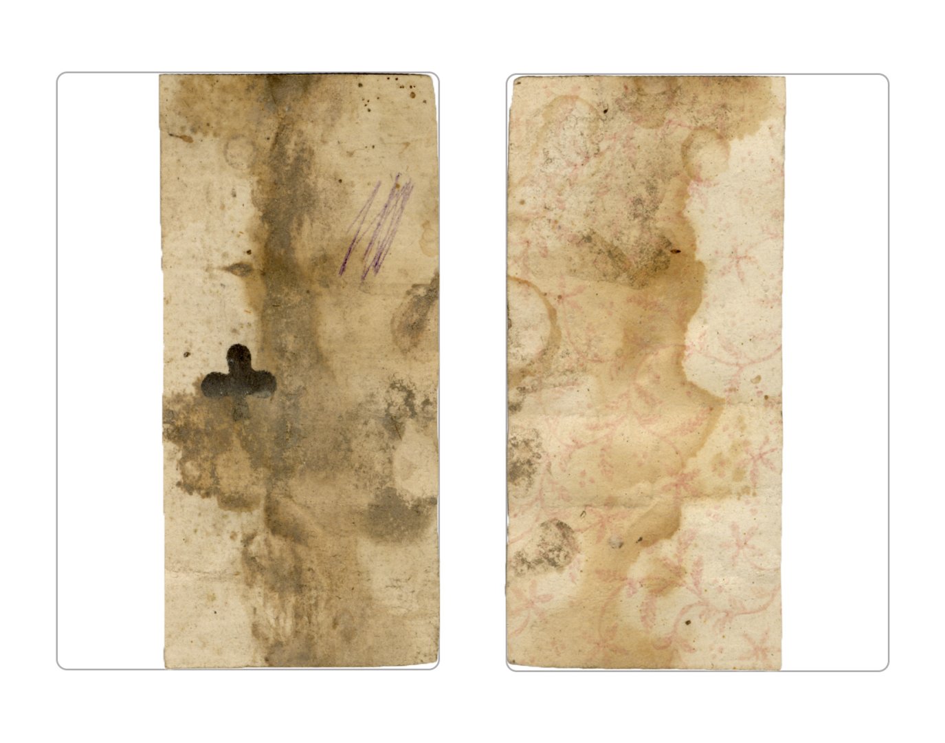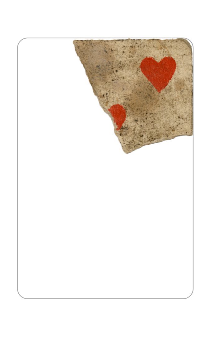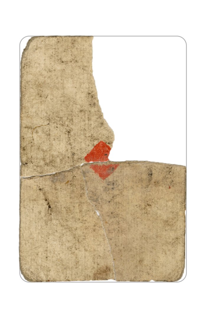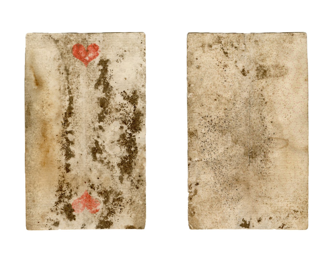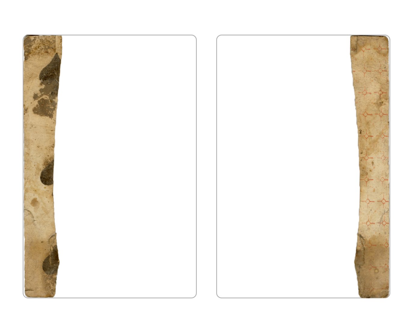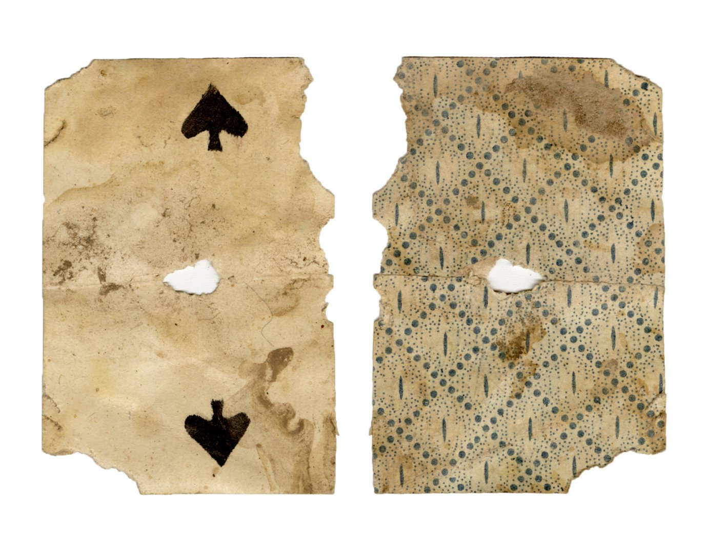 The cards and their fragments all belong to the same deck. The back of the deck features a simple geometrical pattern in red, where rows of red, rhombus-shaped symbols intertwine with fine dotted lines. This pattern, however, appears in multiple countries, and therefore can serve little in the way of authenticating these cards. The British Museum’s collection includes Dutch lottery cards with a very similar pattern. However, these are dated much later – 1820.[22] Furthermore, Colombia University’s digital library contains three types of French-suited card decks with the same pattern, except in blue or black, dated as 1750 [23], 1780 [24] and 1790. [25]