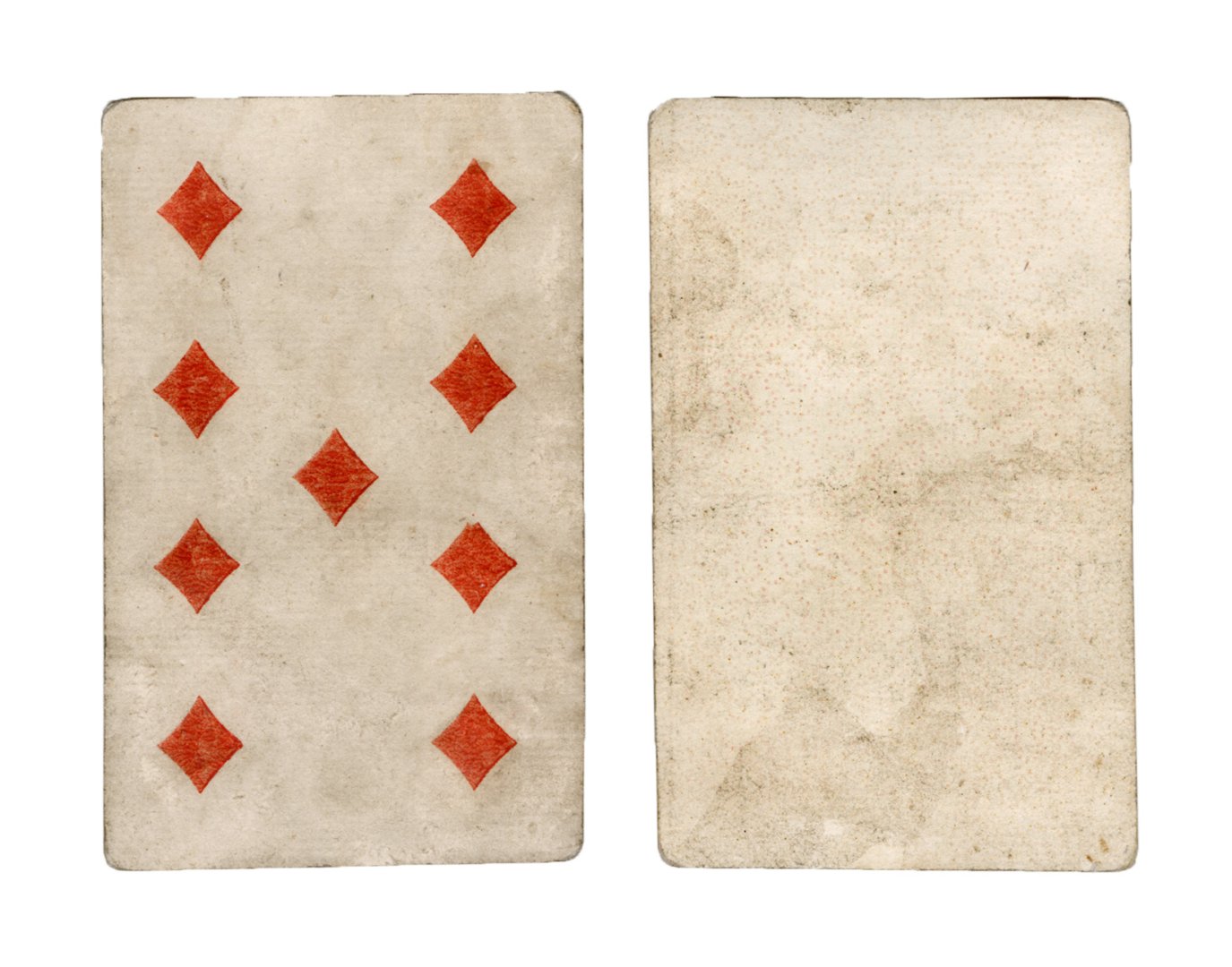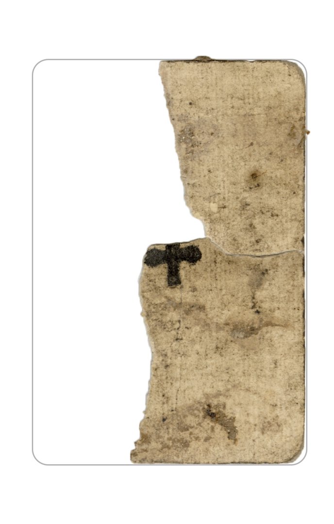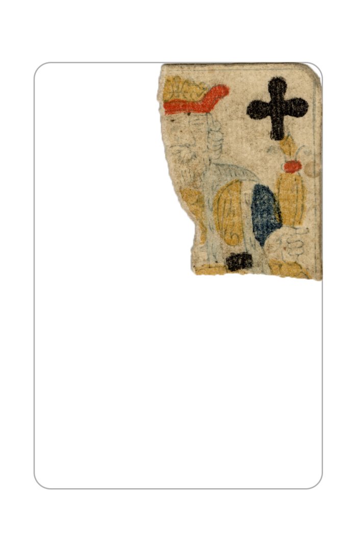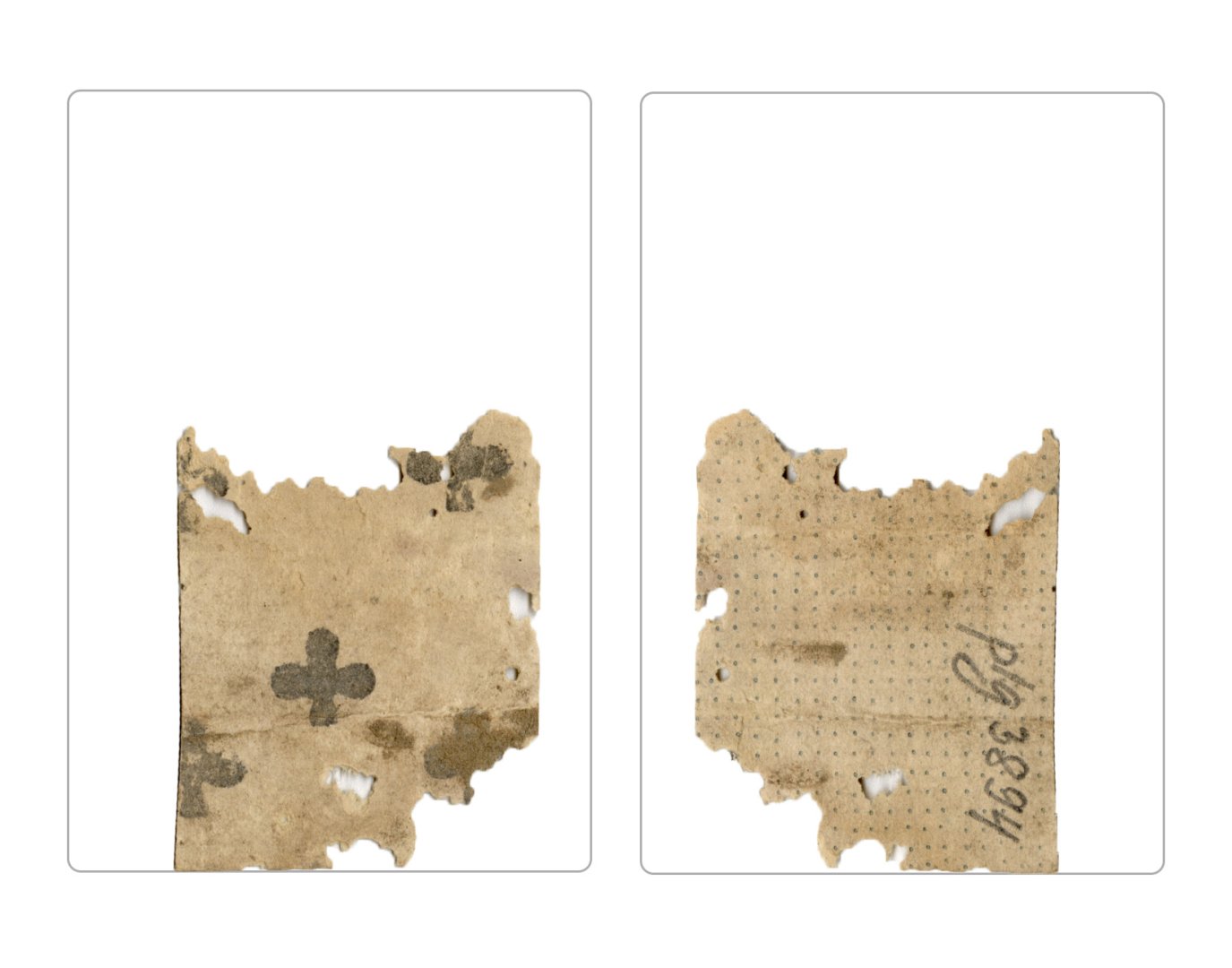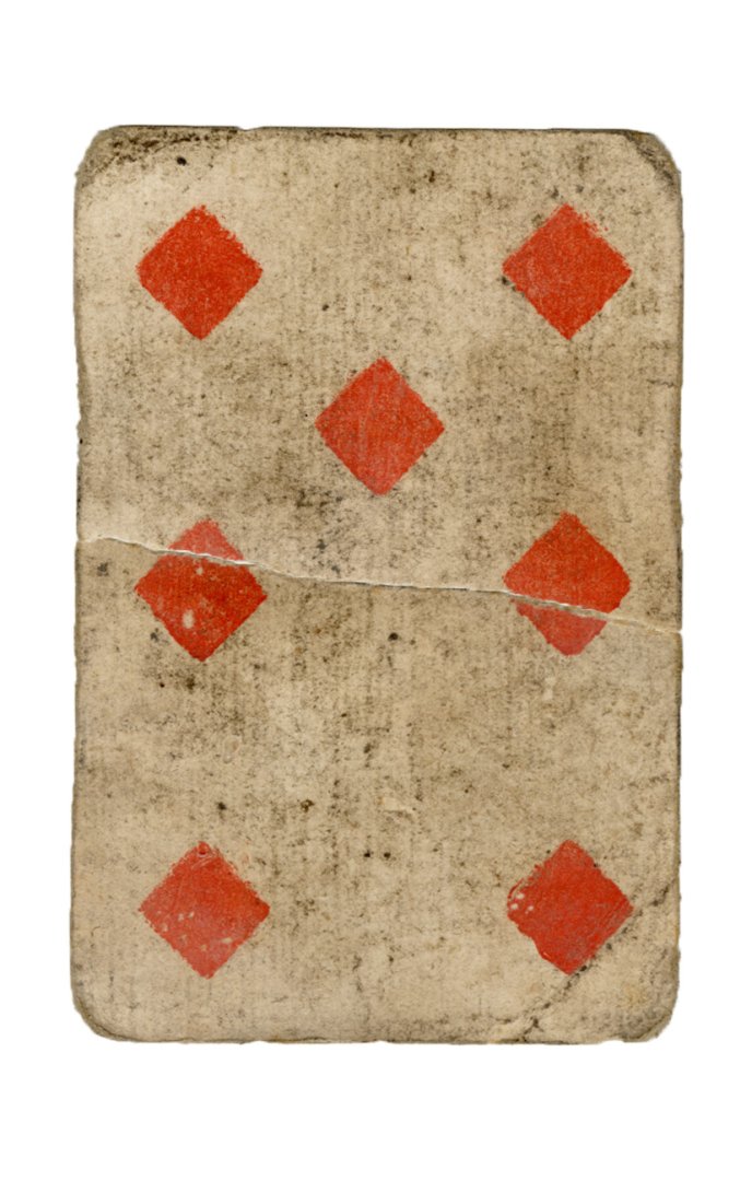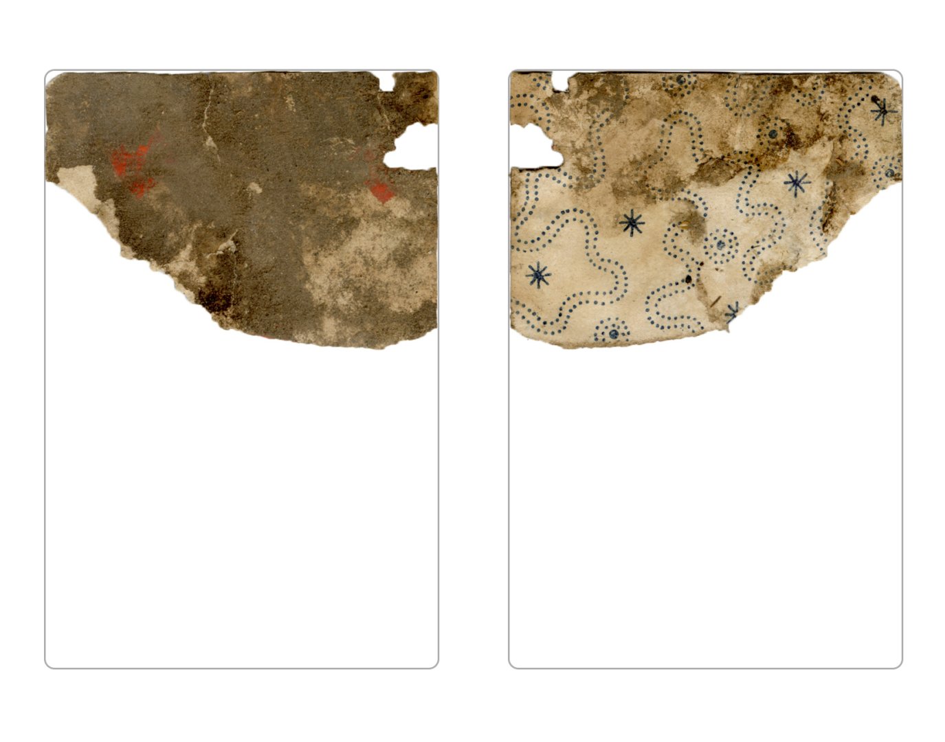 The cards and their fragments all belong to the same deck. The back of the deck features a simple geometrical pattern in red, where rows of red, rhombus-shaped symbols intertwine with fine dotted lines. This pattern, however, appears in multiple countries, and therefore can serve little in the way of authenticating these cards. The British Museum’s collection includes Dutch lottery cards with a very similar pattern. However, these are dated much later – 1820.[22] Furthermore, Colombia University’s digital library contains three types of French-suited card decks with the same pattern, except in blue or black, dated as 1750 [23], 1780 [24] and 1790. [25]
