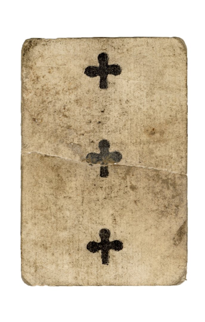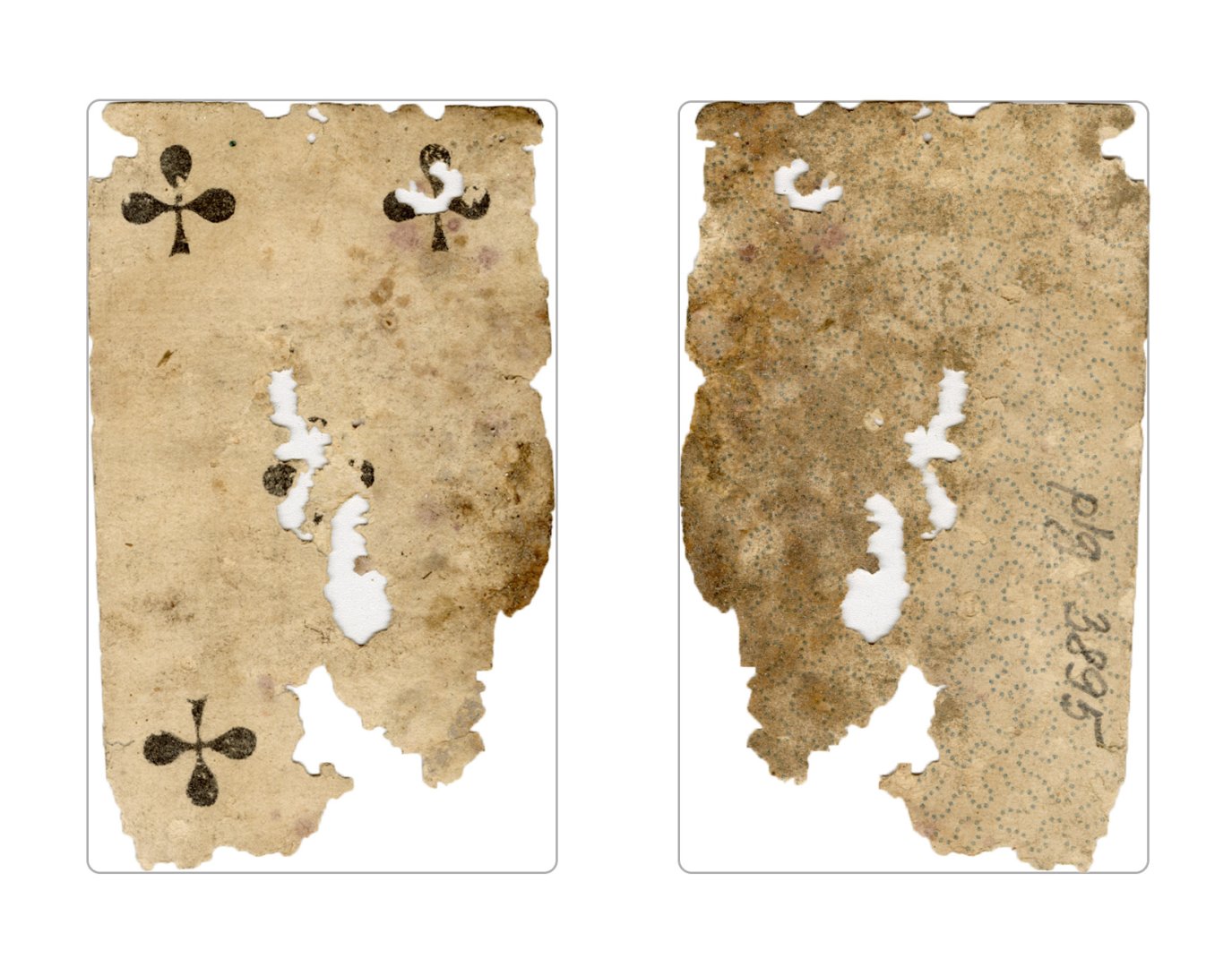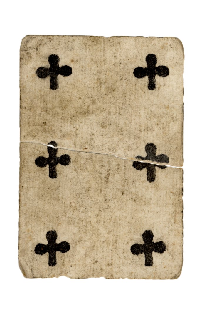 Numeral cards were found on the first, as well as the ground floor (Room 58 and Room 62). Compared to the court cards, these are more difficult to authenticate. There are no distinct stylistic differences in the way the symbols on the cards are depicted, except for the level of detail. Often, older cards will betray thicker traces of stencils, smudges of paint and other irregularities. This is evident on the cards found in rooms 58 and 62. The symbol of clubs on the cards from Room 58 is much thicker and more robust, whereas cards found in Room 62 feature symbols that appear more delicate. However, this can also be deceptive, since resources varied across different card factories, leading to subsequent variations in the quality of their product.