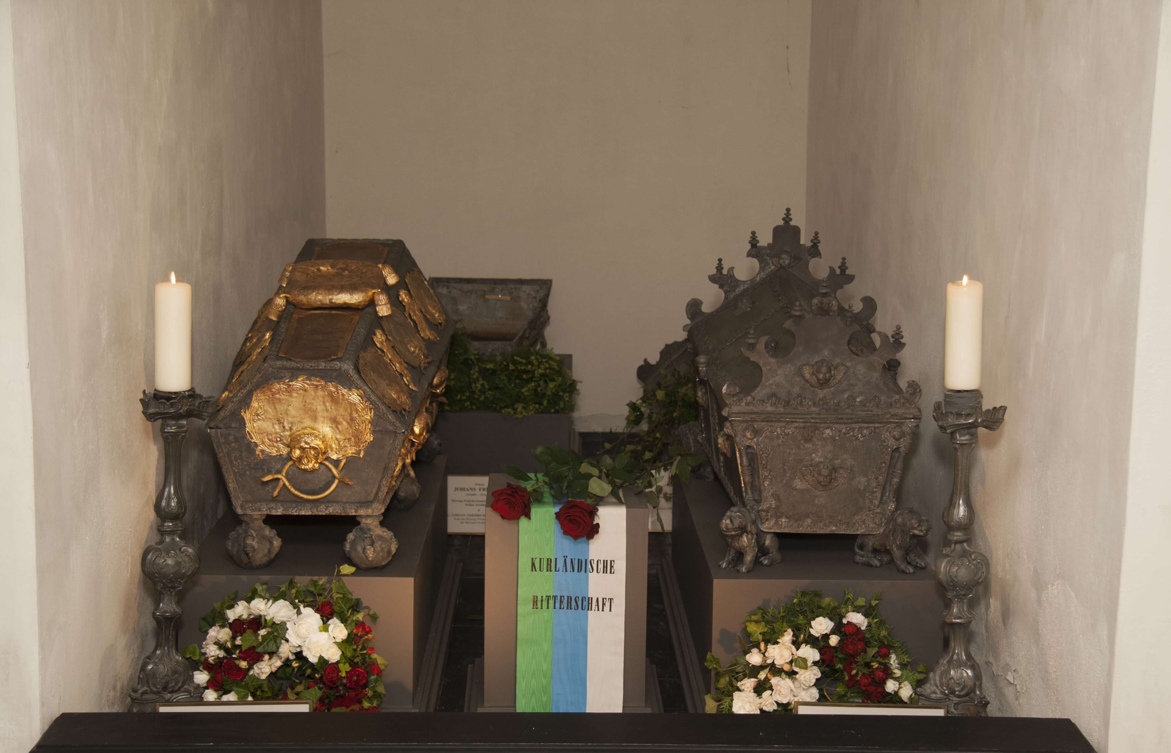 Prince Vladislav Ludwig Friedrich was a son of famous Duke of Courland Jacob, Prince Leopold Karl – son of Duke Friedrich Kasimir and grandson of Duke Jacob. Sarcophagi of both princes had various deformations, fissures and fractures, many elements were lost, pewter was significantly oxidized, gold plating almost completely worn off. The most complicated task was restoration of copper decoration and gold plating of the sarcophagus of Prince Leopold Karl. Restoration and conservation was performed by experts Daira Līdaka, Arvis Druviņš, Gunārs Grīnfelds, Jānis Līdaka and Vilnis Līdaka.