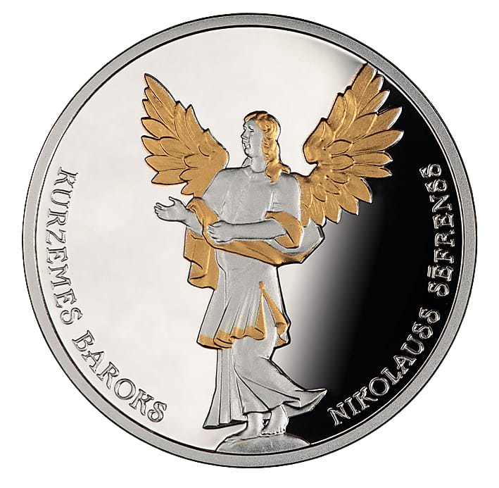 Eņģelis no Lestenes baznīcas altāra. Atveidu ietver lejasdaļā puslokā vietoti uzraksti KURZEMES BAROKS (pa kreisi) un NIKOLAUSS SĒFRENSS (pa labi).