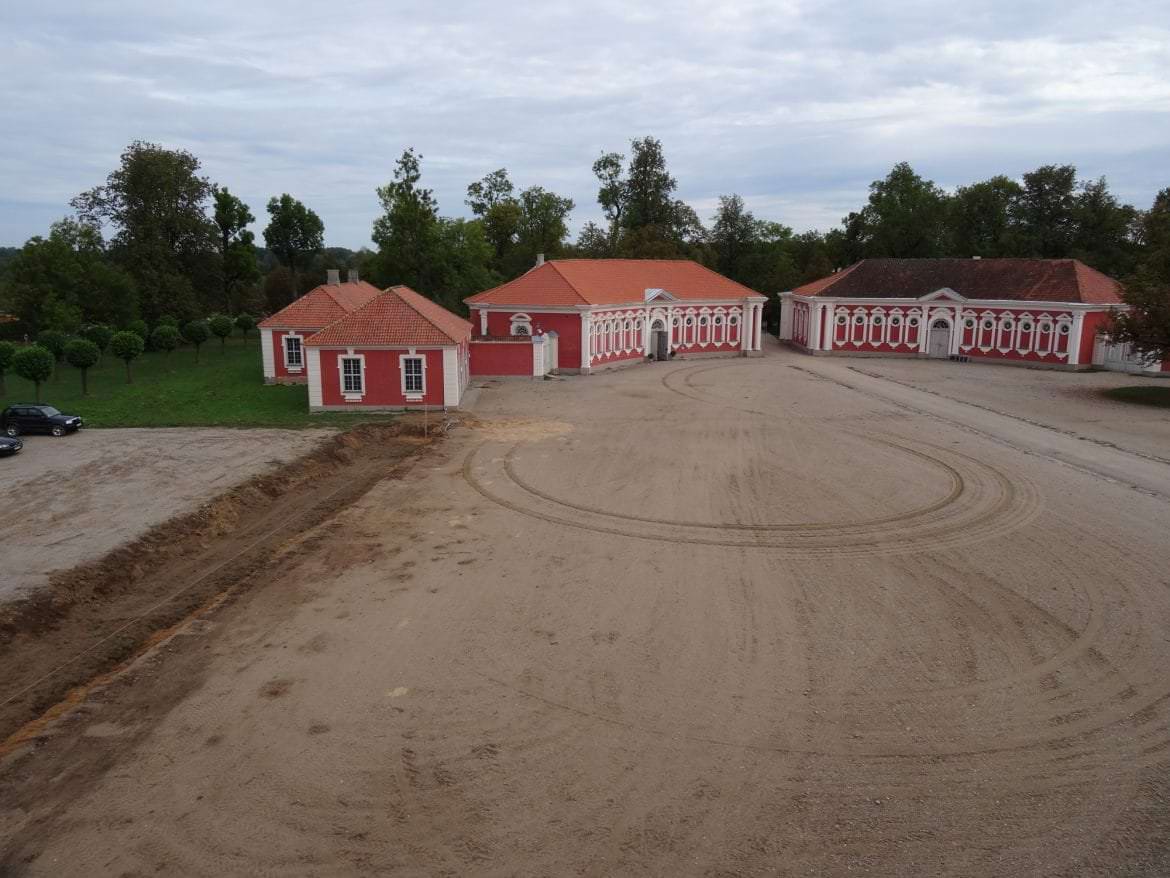 Rundāles pils Kariešu pagalms, ko no ziemeļu puses ietver pusloka staļļu ēkas, līdz šim abās pusēs bija norobežots ar liepu dzīvžogu.
