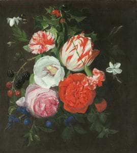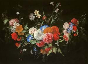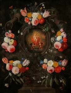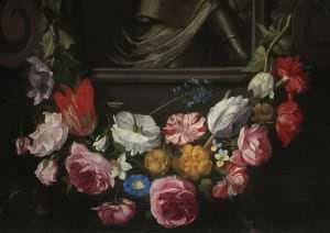 Flāmu gleznotājs Hieronīms Galle Vecākais ir pazīstams galvenokārt ar ziedu gleznojumiem. Glezna pieder retam tipam – parastās vāzēs kārtotas buķetes vietā attēlota ziedu vītne. Viņa darbi ir augstu vērtēti mākslinieciskās kvalitātes un dekoratīvo īpašību dēļ. Gleznotājs pārstāv 17. gadsimta flāmu un holandiešu skolas labākās tradīcijas, kur reālistisks ziedu traktējums savienojas ar virtuozu stilizāciju.