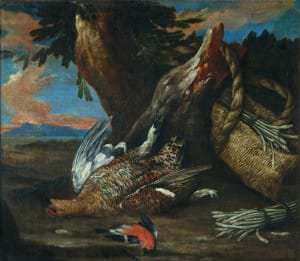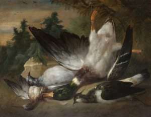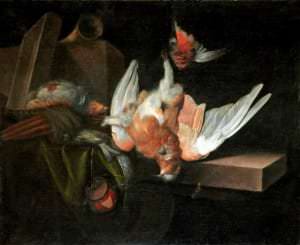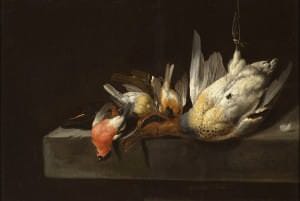 Nelielā izmēra darbs ar iecienīto medību trofeju tēmu pieskaitāms pie t. s. kabineta tipa gleznām, kas paredzētas klusai, intīmai vērošanai. Holandiešu mākslinieks Melhiors d’ Hondekūters bija nepārspējams putnu un dzīvnieku gleznotājs un kluso dabu meistars. Viņa darbus raksturo bagātas tonālās gradācijas, izsmalcināts kolorīts un lielisks materiāla attēlojums apvienojumā ar ļoti izteiksmīgu iekšējo dramaturģiju.