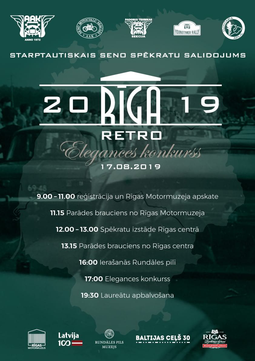 Rīga Retro dalībnieki ar vairāk nekā 100 senajiem spēkratiem pulcēties pie Rīgas Motormuzeja sāks jau no plkst. 8:00. Apskatīt automobiļus pie muzeja būs iespējams līdz plkst. 11:00. Tālāk dalībnieki dosies tradicionālajā parādes braucienā caur Rīgu līdz pat Kalpaka bulvārim, kur apmēram divas stundas notiks spēkratu izstāde. Tālāk brauciens dosies uz Rundāles pili, kur plkst. 17:00 norisināsies spēkratu elegances konkurss, bet plkst. 19:30 tiks apbalvoti laureāti.