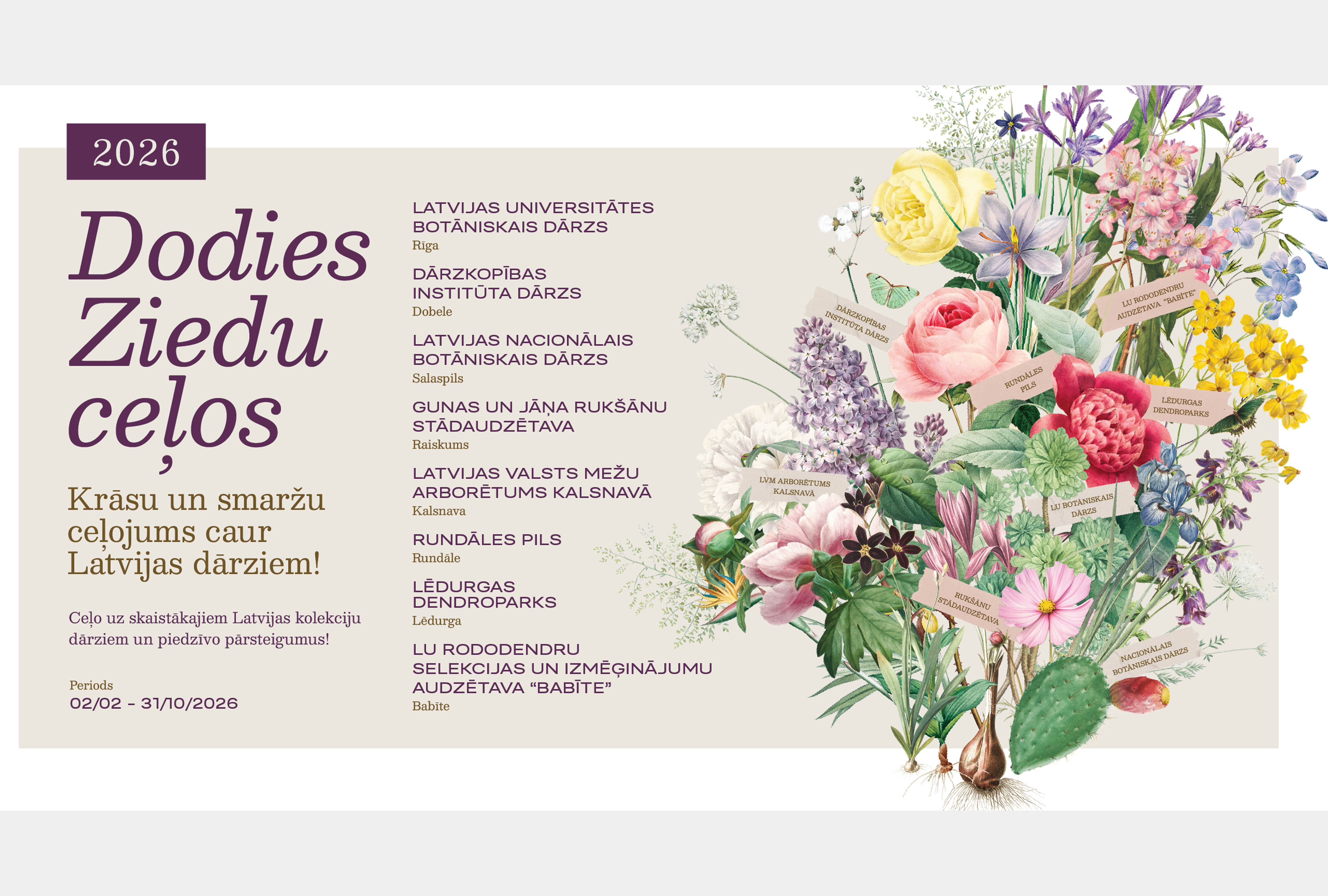 Dārzkopības institūta ceriņu dārzs, Gunas un Jāņa Rukšānu kolekcija, Latvijas Nacionālais botāniskais dārzs, Lēdurgas dendroparks, Latvijas Universitātes Botāniskais dārzs, Latvijas Universitātes Rododendru selekcijas un izmēģinājumu audzētava “Babīte”, Latvijas valsts mežu arborētums Kalsnavā un Rundāles pils dod iespēju baudīt, izzināt un svinēt, piedāvājot izzinošas un aizraujošas ekskursijas, dažādus kultūras notikumus un vietu svētkiem. Tās nav tikai ziedošās kolekcijas, bet ceļojums arī caur citām kokaugu grupām, kas veidotas gadu desmitiem un vietām pat simtiem gadu, apvienojot zināšanas un degsmi..